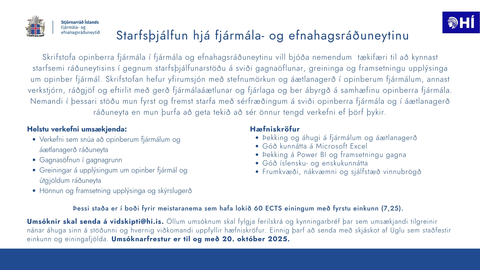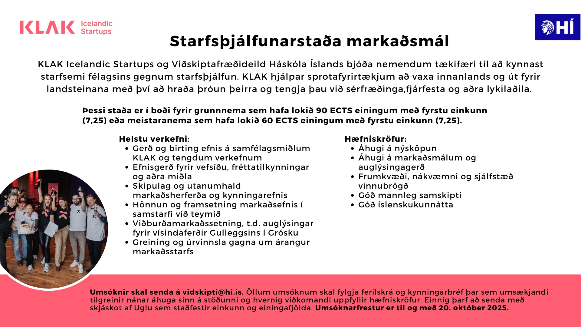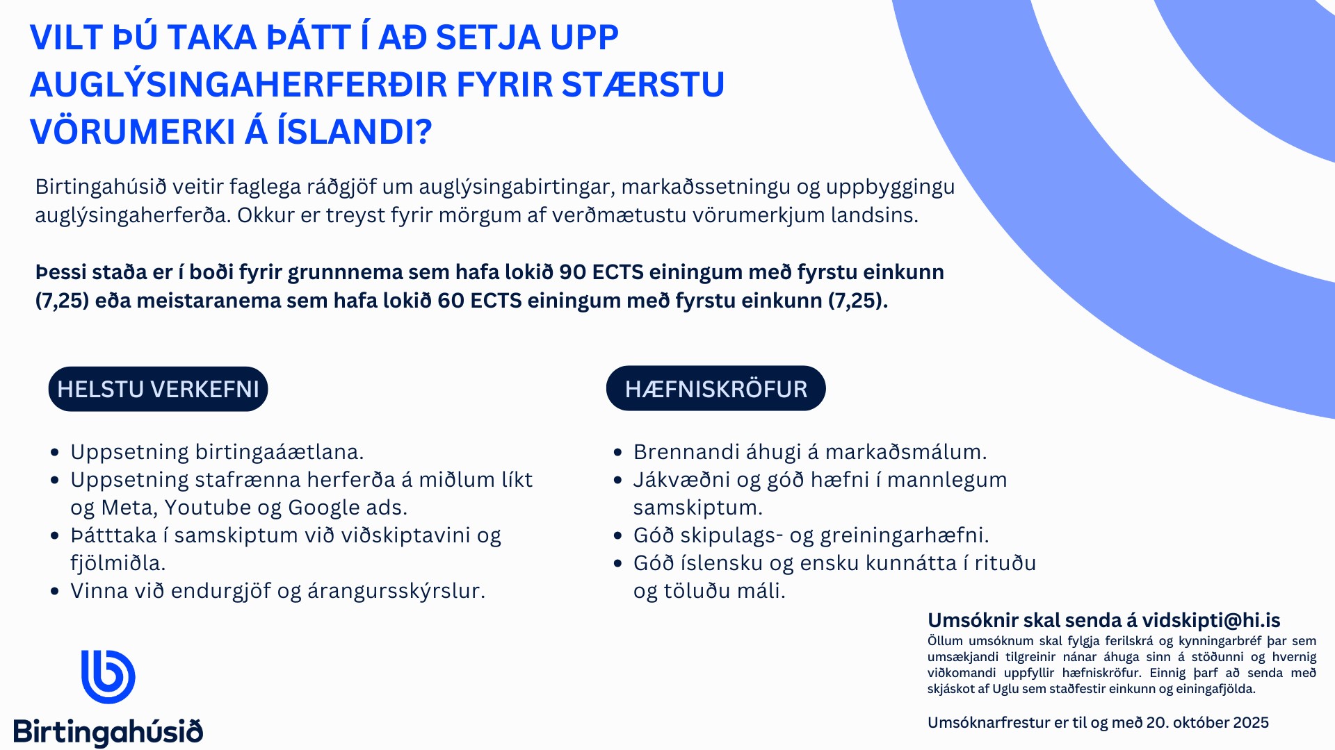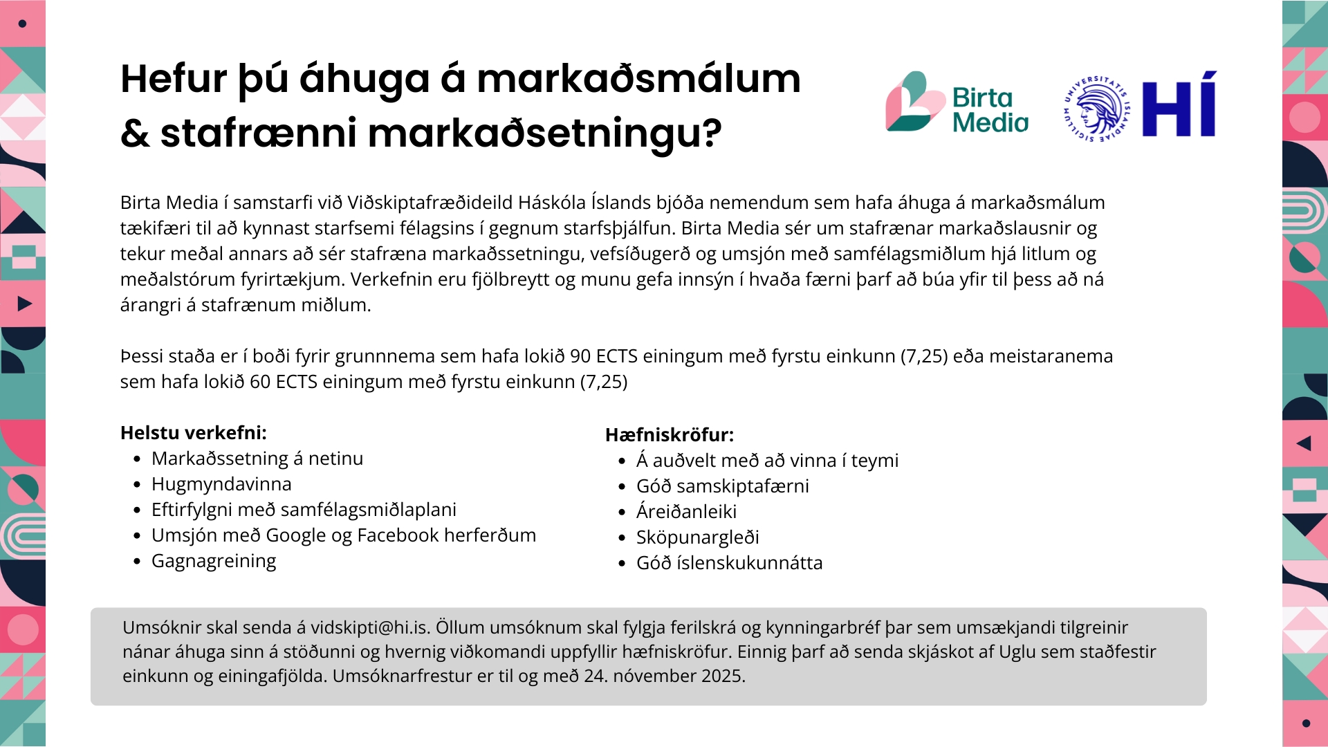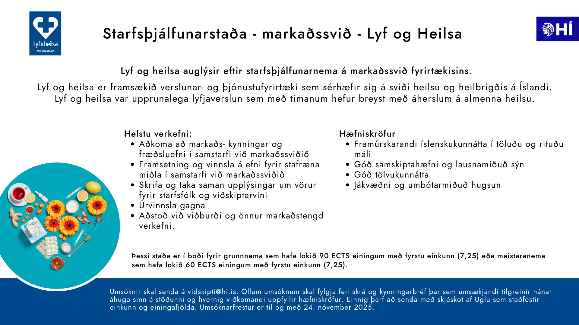Viðskiptafræðideild Háskóla Íslands er í nánu samstarfi við atvinnulífið og býður nemendum í grunn- og meistaranámi að taka þátt í starfsþjálfun hjá fjölbreyttum fyrirtækjum, stofnunum og félagasamtökum. Nýjar stöður umsóknarfrestur 24. nóvember 2025 66°N Stækka mynd 66°N og Viðskiptafræðideild Háskóla Íslands bjóða nemendum tækifæri til að kynnast starfsemi félagsins gegnum starfsþjálfun. Þessi staða er í boði fyrir grunnnema sem lokið hafa 90 ECTS með fyrstu einkunn (7,25) eða meistaranema sem lokið hafa 60 ECTS með fyrstu einkunn (7,25). Helstu verkefni: Aðstoða með sjálfbærniuppgjör fyrirtækisins Safna saman upplýsingum og undirbúa undir reikning á kolefnisfótspori Aðstoð við sjálfbærniskýrslu. Hæfniskröfur: Áhugi á sjálfbærni Hæfni í mannlegum samskiptum Jákvæðni Stundvísi Heiðarleiki Nákvæmni Umsóknir skal senda á vidskipti@hi.is. Öllum umsóknum skal fylgja ferilskrá og kynningarbréf þar sem umsækjandi tilgreinir nánar áhuga sinn á stöðunni og hvernig viðkomandi uppfyllir hæfniskröfur. Einnig þarf að senda með skjáskot af Uglu sem staðfestir einkunn og einingafjölda. Umsóknarfrestur er til og með 24. nóvember 2025. Birta Media Stækka mynd Birta Media í samstarfi við Viðskiptafræðideild Háskóla Íslands bjóða nemendum sem hafa áhuga á markaðsmálum tækifæri til að kynnast starfsemi félagsins í gegnum starfsþjálfun. Birta Media sér um stafrænar markaðslausnir og tekur meðal annars að sér stafræna markaðssetningu, vefsíðugerð og umsjón með samfélagsmiðlum hjá litlum og meðalstórum fyrirtækjum. Verkefnin eru fjölbreytt og munu gefa innsýn í hvaða færni þarf að búa yfir til þess að ná árangri á stafrænum miðlum. Helstu verkefni: Markaðssetning á netinu Hugmyndavinna Eftirfylgni með samfélagsmiðlaplani Umsjón með Google og Facebook herferðum Gagnagreining Hæfniskröfur: Á auðvelt með að vinna í teymi Góð samskiptafærni Áreiðanleiki Sköpunargleði Góð íslenskukunnátta Þessi staða er í boði fyrir grunnnema sem hafa lokið 90 ECTS einingum með fyrstu einkunn (7,25) eða meistaranema sem hafa lokið 60 ECTS einingum með fyrstu einkunn (7,25). Umsóknir skal senda á vidskipti@hi.is. Öllum umsóknum skal fylgja ferilskrá og kynningarbréf þar sem umsækjandi tilgreinir nánar áhuga sinn á stöðunni og hvernig viðkomandi uppfyllir hæfniskröfur. Einnig þarf að senda með skjáskot af Uglu sem staðfestir einkunn og einingafjölda. Umsóknarfrestur er til og með 24. nóvember 2025. Lyf og heilsa Stækka mynd Lyf og heilsa auglýsir eftir starfsþjálfunarnema á markaðssvið fyrirtækisins. Lyf og heilsa er framsækið verslunar- og þjónustufyrirtæki sem sérhæfir sig á sviði heilsu og heilbrigðis á Íslandi. Lyf og heilsa var upprunalega lyfjaverslun sem með tímanum hefur breyst með áherslum á almenna heilsu. Þessi staða er í boði fyrir grunnnema sem lokið hafa 90 ECTS með fyrstu einkunn (7,25) eða meistaranema sem lokið hafa 60 ECTS með fyrstu einkunn (7,25). Helstu verkefni: Aðkoma að markaðs- kynningar og fræðsluefni í samstarfi við markaðssviðið Framsetning og vinnsla á efni fyrir stafræna miðla í samstarfi við markaðssviðið Skrifa og taka saman upplýsingar um vörur fyrir starfsfólk og viðskiptarvini Úrvinnsla gagna Aðstoð við viðburði og önnur markaðstengd verkefni Hæfniskröfur: Framúrskarandi íslenskukunnátta í töluðu og rituðu máli Góð samskiptahæfni og lausnamiðuð sýn Góð tölvukunnátta Jákvæðni og umbótarmiðuð hugsun Umsóknir skal senda á vidskipti@hi.is. Öllum umsóknum skal fylgja ferilskrá og kynningarbréf þar sem umsækjandi tilgreinir nánar áhuga sinn á stöðunni og hvernig viðkomandi uppfyllir hæfniskröfur. Einnig þarf að senda með skjáskot af Uglu sem staðfestir einkunn og einingafjölda. Umsóknarfrestur er til og með 24. nóvember 2025. Nýsköpunarsjóðurinn Kría Stækka mynd Nýsköpunarsjóðurinn Kría (NSK) og Viðskiptafræðideild Háskóla Íslands bjóða nemendum tækifæri til að kynnast starfsemi sjóðsins í gegnum starfsþjálfun. NSK fjárfestir í sprota- og nýsköpunarfyrirtækjum á fyrstu stigum og styður við nýsköpunarumhverfið á Íslandi. NSK fjárfestir í sjóðum sem sérhæfa sig í fjárfestingum í sprotafyrirtækjum s.s. vísisjóðum og sérhæfðum fjárfestingasjóðum og er í beinum fjárfestingum í sprotafyrirtækjum Í starfsþjálfun hjá NSK fá nemar innsýn inn í hin ýmsu verkefni NSK. Þessi staða er í boði fyrir grunnnema sem lokið hafa 90 ECTS með fyrstu einkunn (7,25) eða meistaranema sem lokið hafa 60 ECTS með fyrstu einkunn (7,25). Hæfniskröfur: Áhugi á nýsköpun Frumkvæði, nákvæmni og sjálfstæð vinnubrögð Góð samskiptahæfni Góð íslenskukunnátta Umsóknir skal senda á vidskipti@hi.is. Öllum umsóknum skal fylgja ferilskrá og kynningarbréf þar sem umsækjandi tilgreinir nánar áhuga sinn á stöðunni og hvernig viðkomandi uppfyllir hæfniskröfur. Einnig þarf að senda með skjáskot af Uglu sem staðfestir einkunn og einingafjölda. Umsóknarfrestur er til og með 24. nóvember 2025. Orkuveitan Stækka mynd Starfsnemi – Jafnréttistímalína Orkuveitunnar Hefur þú áhuga á jafnrétti, fólki og frásögn? Við leitum að skapandi nemanda í starfsnám til að taka virkan þátt í að móta og miðla jafnréttissögu Orkuveitunnar og dótturfélaga hennar. Um verkefnið Markmiðið er að gera jafnréttisvinnu Orkuveitunnar lifandi og sýnilega með því að þróa stafræna jafnréttistímalínu á heimasíðu okkar. Verkefnið er samvinnuverkefni milli mannauðs og samskiptadeildar og felur í sér að tengjast fólki innan fyrirtækisins og skapa efni sem vekur áhuga og sýnir árangurinn á skapandi og skemmtilegan hátt. Þú munt meðal annars: Eiga samtöl við fólk