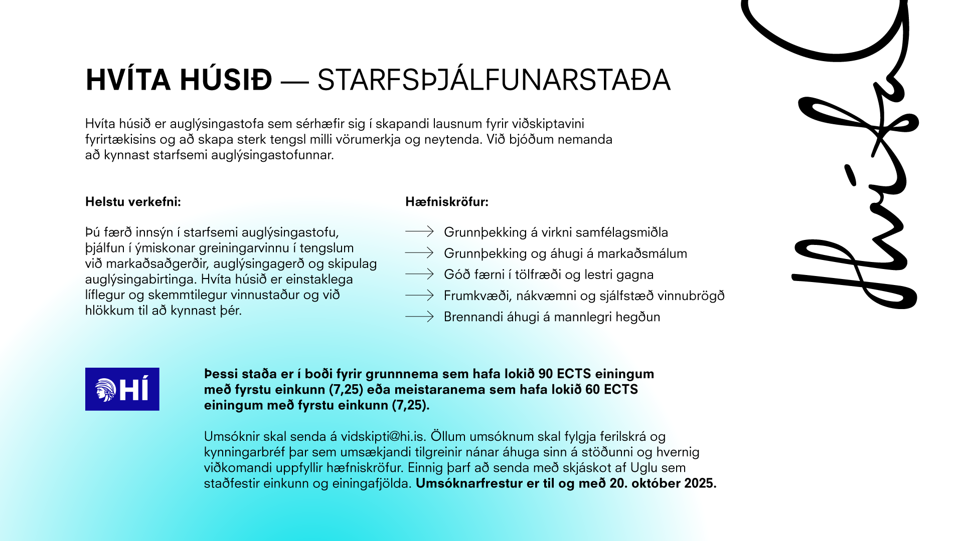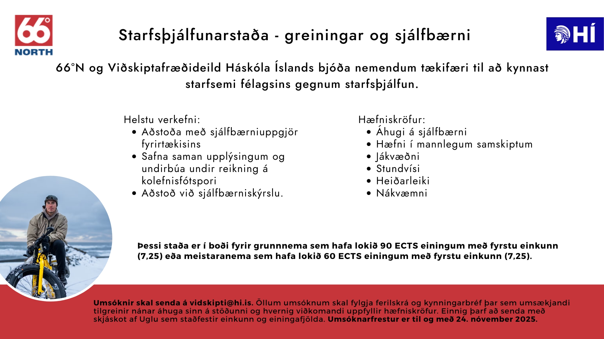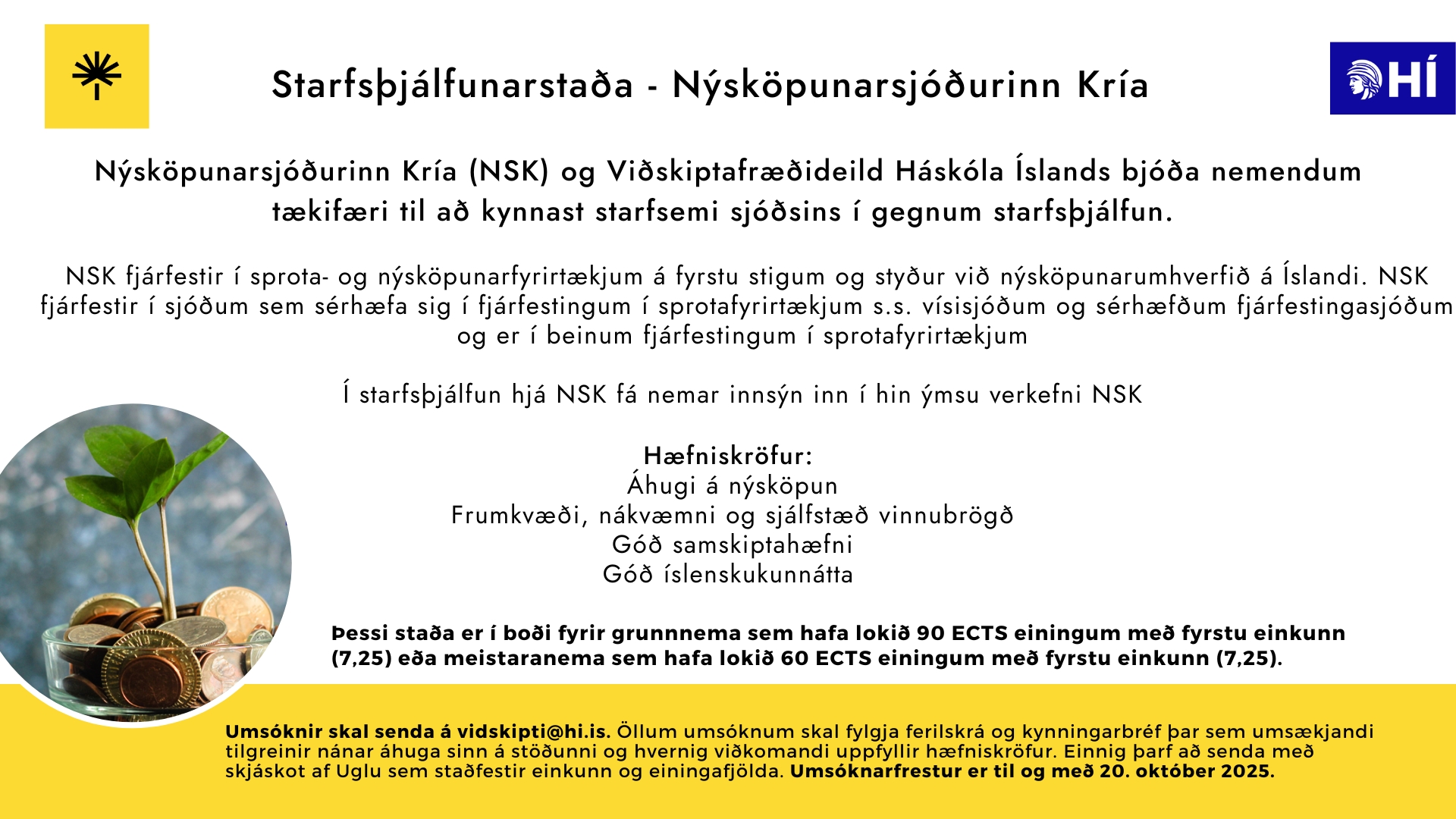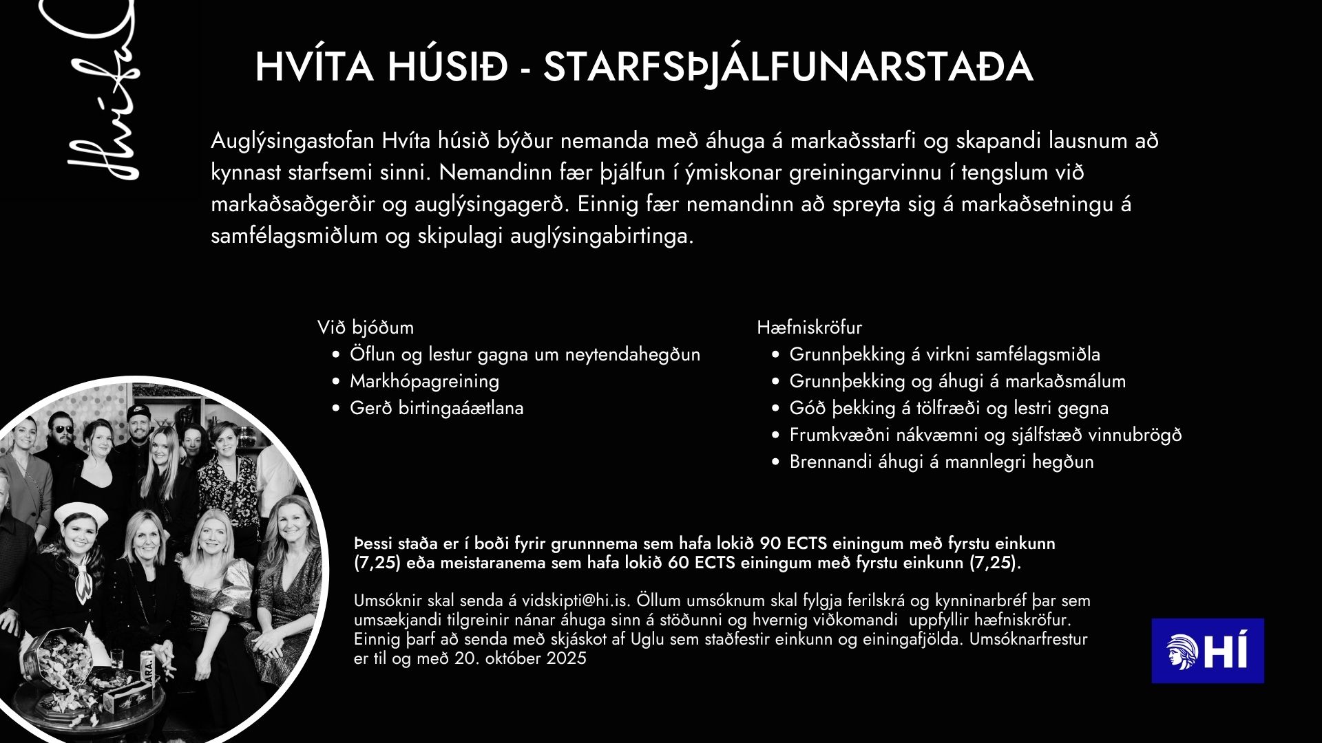 Viðskiptafræðideild Háskóla Íslands er í nánu samstarfi við atvinnulífið og býður nemendum í grunn- og meistaranámi að taka þátt í starfsþjálfun hjá fjölbreyttum fyrirtækjum, stofnunum og félagasamtökum. Nýjar stöður umsóknarfrestur 24. nóvember 2025 66°N Stækka mynd 66°N og Viðskiptafræðideild Háskóla Íslands bjóða nemendum tækifæri til að kynnast starfsemi félagsins gegnum starfsþjálfun. Þessi staða er í boði fyrir grunnnema sem lokið hafa 90 ECTS með fyrstu einkunn (7,25) eða meistaranema sem lokið hafa 60 ECTS með fyrstu einkunn (7,25). Helstu verkefni: Aðstoða með sjálfbærniuppgjör fyrirtækisins Safna saman upplýsingum og undirbúa undir reikning á kolefnisfótspori Aðstoð við sjálfbærniskýrslu. Hæfniskröfur: Áhugi á sjálfbærni Hæfni í mannlegum samskiptum Jákvæðni Stundvísi Heiðarleiki Nákvæmni Umsóknir skal senda á vidskipti@hi.is. Öllum umsóknum skal fylgja ferilskrá og kynningarbréf þar sem umsækjandi tilgreinir nánar áhuga sinn á stöðunni og hvernig viðkomandi uppfyllir hæfniskröfur. Einnig þarf að senda með skjáskot af Uglu sem staðfestir einkunn og einingafjölda. Umsóknarfrestur er til og með 24. nóvember 2025. Birta Media Stækka mynd Birta Media í samstarfi við Viðskiptafræðideild Háskóla Íslands bjóða nemendum sem hafa áhuga á markaðsmálum tækifæri til að kynnast starfsemi félagsins í gegnum starfsþjálfun. Birta Media sér um stafrænar markaðslausnir og tekur meðal annars að sér stafræna markaðssetningu, vefsíðugerð og umsjón með samfélagsmiðlum hjá litlum og meðalstórum fyrirtækjum. Verkefnin eru fjölbreytt og munu gefa innsýn í hvaða færni þarf að búa yfir til þess að ná árangri á stafrænum miðlum. Helstu verkefni: Markaðssetning á netinu Hugmyndavinna Eftirfylgni með samfélagsmiðlaplani Umsjón með Google og Facebook herferðum Gagnagreining Hæfniskröfur: Á auðvelt með að vinna í teymi Góð samskiptafærni Áreiðanleiki Sköpunargleði Góð íslenskukunnátta Þessi staða er í boði fyrir grunnnema sem hafa lokið 90 ECTS einingum með fyrstu einkunn (7,25) eða meistaranema sem hafa lokið 60 ECTS einingum með fyrstu einkunn (7,25). Umsóknir skal senda á vidskipti@hi.is. Öllum umsóknum skal fylgja ferilskrá og kynningarbréf þar sem umsækjandi tilgreinir nánar áhuga sinn á stöðunni og hvernig viðkomandi uppfyllir hæfniskröfur. Einnig þarf að senda með skjáskot af Uglu sem staðfestir einkunn og einingafjölda. Umsóknarfrestur er til og með 24. nóvember 2025. Lyf og heilsa Stækka mynd Lyf og heilsa auglýsir eftir starfsþjálfunarnema á markaðssvið fyrirtækisins. Lyf og heilsa er framsækið verslunar- og þjónustufyrirtæki sem sérhæfir sig á sviði heilsu og heilbrigðis á Íslandi. Lyf og heilsa var upprunalega lyfjaverslun sem með tímanum hefur breyst með áherslum á almenna heilsu. Þessi staða er í boði fyrir grunnnema sem lokið hafa 90 ECTS með fyrstu einkunn (7,25) eða meistaranema sem lokið hafa 60 ECTS með fyrstu einkunn (7,25). Helstu verkefni: Aðkoma að markaðs- kynningar og fræðsluefni í samstarfi við markaðssviðið Framsetning og vinnsla á efni fyrir stafræna miðla í samstarfi við markaðssviðið Skrifa og taka saman upplýsingar um vörur fyrir starfsfólk og viðskiptarvini Úrvinnsla gagna Aðstoð við viðburði og önnur markaðstengd verkefni Hæfniskröfur: Framúrskarandi íslenskukunnátta í töluðu og rituðu máli Góð samskiptahæfni og lausnamiðuð sýn Góð tölvukunnátta Jákvæðni og umbótarmiðuð hugsun Umsóknir skal senda á vidskipti@hi.is. Öllum umsóknum skal fylgja ferilskrá og kynningarbréf þar sem umsækjandi tilgreinir nánar áhuga sinn á stöðunni og hvernig viðkomandi uppfyllir hæfniskröfur. Einnig þarf að senda með skjáskot af Uglu sem staðfestir einkunn og einingafjölda. Umsóknarfrestur er til og með 24. nóvember 2025. Nýsköpunarsjóðurinn Kría Stækka mynd Nýsköpunarsjóðurinn Kría (NSK) og Viðskiptafræðideild Háskóla Íslands bjóða nemendum tækifæri til að kynnast starfsemi sjóðsins í gegnum starfsþjálfun. NSK fjárfestir í sprota- og nýsköpunarfyrirtækjum á fyrstu stigum og styður við nýsköpunarumhverfið á Íslandi. NSK fjárfestir í sjóðum sem sérhæfa sig í fjárfestingum í sprotafyrirtækjum s.s. vísisjóðum og sérhæfðum fjárfestingasjóðum og er í beinum fjárfestingum í sprotafyrirtækjum Í starfsþjálfun hjá NSK fá nemar innsýn inn í hin ýmsu verkefni NSK. Þessi staða er í boði fyrir grunnnema sem lokið hafa 90 ECTS með fyrstu einkunn (7,25) eða meistaranema sem lokið hafa 60 ECTS með fyrstu einkunn (7,25). Hæfniskröfur: Áhugi á nýsköpun Frumkvæði, nákvæmni og sjálfstæð vinnubrögð Góð samskiptahæfni Góð íslenskukunnátta Umsóknir skal senda á vidskipti@hi.is. Öllum umsóknum skal fylgja ferilskrá og kynningarbréf þar sem umsækjandi tilgreinir nánar áhuga sinn á stöðunni og hvernig viðkomandi uppfyllir hæfniskröfur. Einnig þarf að senda með skjáskot af Uglu sem staðfestir einkunn og einingafjölda. Umsóknarfrestur er til og með 24. nóvember 2025. Orkuveitan Stækka mynd Starfsnemi – Jafnréttistímalína Orkuveitunnar Hefur þú áhuga á jafnrétti, fólki og frásögn? Við leitum að skapandi nemanda í starfsnám til að taka virkan þátt í að móta og miðla jafnréttissögu Orkuveitunnar og dótturfélaga hennar. Um verkefnið Markmiðið er að gera jafnréttisvinnu Orkuveitunnar lifandi og sýnilega með því að þróa stafræna jafnréttistímalínu á heimasíðu okkar. Verkefnið er samvinnuverkefni milli mannauðs og samskiptadeildar og felur í sér að tengjast fólki innan fyrirtækisins og skapa efni sem vekur áhuga og sýnir árangurinn á skapandi og skemmtilegan hátt. Þú munt meðal annars: Eiga samtöl við fólk