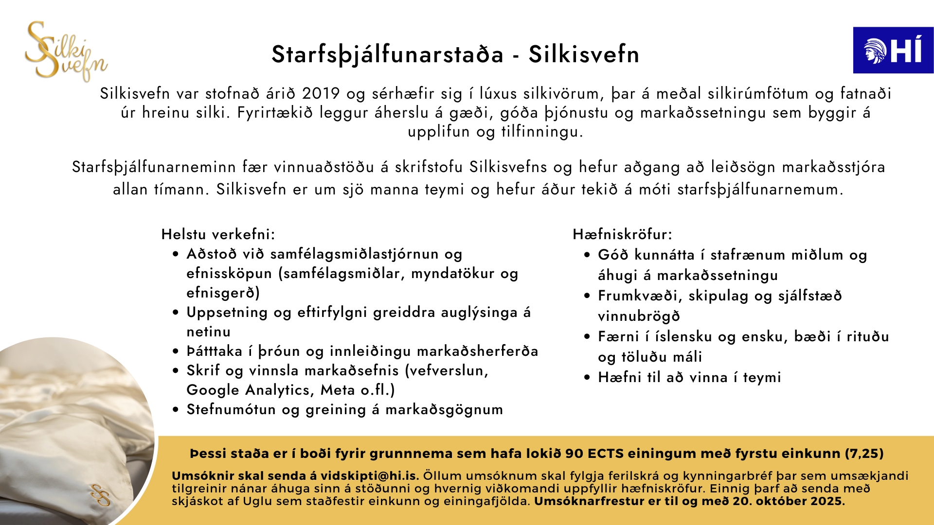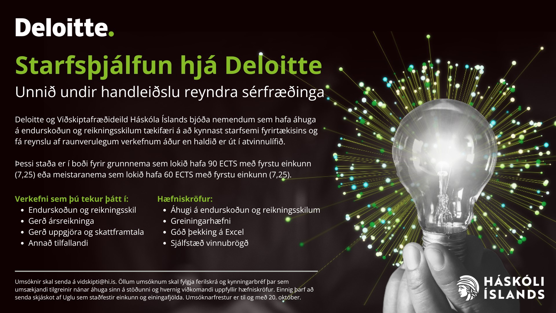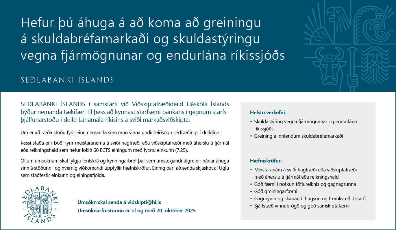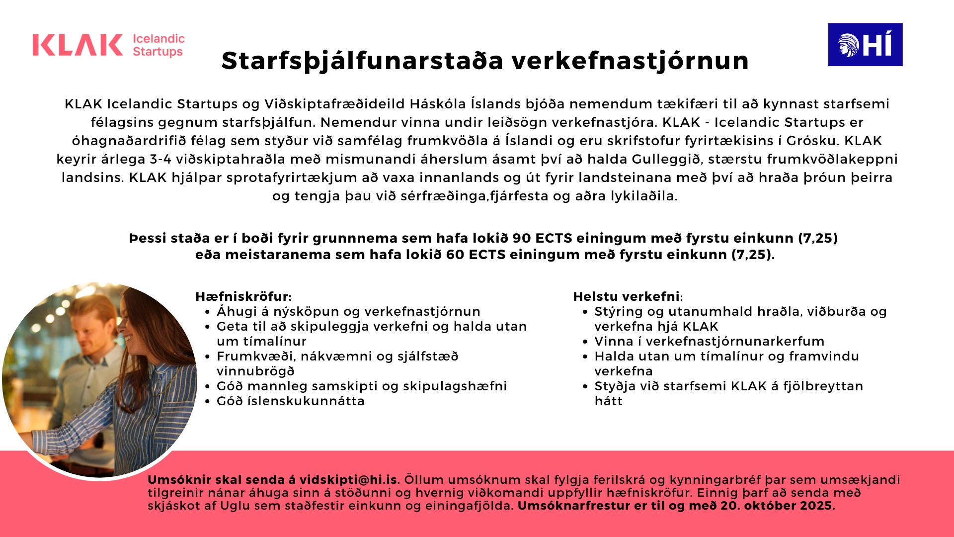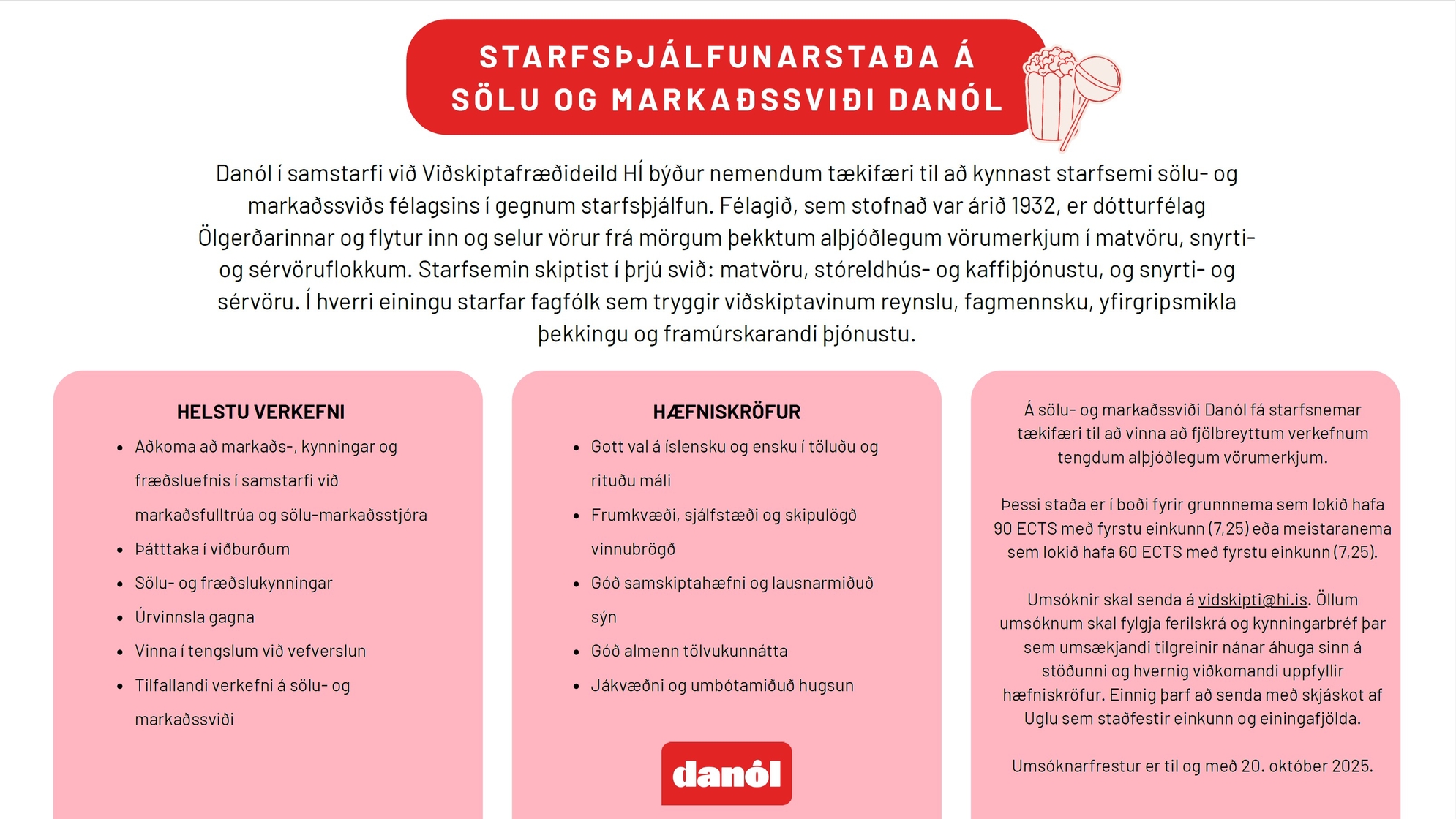 Viðskiptafræðideild Háskóla Íslands er í nánu samstarfi við atvinnulífið og býður nemendum í grunn- og meistaranámi að taka þátt í starfsþjálfun hjá fjölbreyttum fyrirtækjum, stofnunum og félagasamtökum. Nýjar stöður umsóknarfrestur 24. nóvember 2025 66°N Stækka mynd 66°N og Viðskiptafræðideild Háskóla Íslands bjóða nemendum tækifæri til að kynnast starfsemi félagsins gegnum starfsþjálfun. Þessi staða er í boði fyrir grunnnema sem lokið hafa 90 ECTS með fyrstu einkunn (7,25) eða meistaranema sem lokið hafa 60 ECTS með fyrstu einkunn (7,25). Helstu verkefni: Aðstoða með sjálfbærniuppgjör fyrirtækisins Safna saman upplýsingum og undirbúa undir reikning á kolefnisfótspori Aðstoð við sjálfbærniskýrslu. Hæfniskröfur: Áhugi á sjálfbærni Hæfni í mannlegum samskiptum Jákvæðni Stundvísi Heiðarleiki Nákvæmni Umsóknir skal senda á vidskipti@hi.is. Öllum umsóknum skal fylgja ferilskrá og kynningarbréf þar sem umsækjandi tilgreinir nánar áhuga sinn á stöðunni og hvernig viðkomandi uppfyllir hæfniskröfur. Einnig þarf að senda með skjáskot af Uglu sem staðfestir einkunn og einingafjölda. Umsóknarfrestur er til og með 24. nóvember 2025. Birta Media Stækka mynd Birta Media í samstarfi við Viðskiptafræðideild Háskóla Íslands bjóða nemendum sem hafa áhuga á markaðsmálum tækifæri til að kynnast starfsemi félagsins í gegnum starfsþjálfun. Birta Media sér um stafrænar markaðslausnir og tekur meðal annars að sér stafræna markaðssetningu, vefsíðugerð og umsjón með samfélagsmiðlum hjá litlum og meðalstórum fyrirtækjum. Verkefnin eru fjölbreytt og munu gefa innsýn í hvaða færni þarf að búa yfir til þess að ná árangri á stafrænum miðlum. Helstu verkefni: Markaðssetning á netinu Hugmyndavinna Eftirfylgni með samfélagsmiðlaplani Umsjón með Google og Facebook herferðum Gagnagreining Hæfniskröfur: Á auðvelt með að vinna í teymi Góð samskiptafærni Áreiðanleiki Sköpunargleði Góð íslenskukunnátta Þessi staða er í boði fyrir grunnnema sem hafa lokið 90 ECTS einingum með fyrstu einkunn (7,25) eða meistaranema sem hafa lokið 60 ECTS einingum með fyrstu einkunn (7,25). Umsóknir skal senda á vidskipti@hi.is. Öllum umsóknum skal fylgja ferilskrá og kynningarbréf þar sem umsækjandi tilgreinir nánar áhuga sinn á stöðunni og hvernig viðkomandi uppfyllir hæfniskröfur. Einnig þarf að senda með skjáskot af Uglu sem staðfestir einkunn og einingafjölda. Umsóknarfrestur er til og með 24. nóvember 2025. Lyf og heilsa Stækka mynd Lyf og heilsa auglýsir eftir starfsþjálfunarnema á markaðssvið fyrirtækisins. Lyf og heilsa er framsækið verslunar- og þjónustufyrirtæki sem sérhæfir sig á sviði heilsu og heilbrigðis á Íslandi. Lyf og heilsa var upprunalega lyfjaverslun sem með tímanum hefur breyst með áherslum á almenna heilsu. Þessi staða er í boði fyrir grunnnema sem lokið hafa 90 ECTS með fyrstu einkunn (7,25) eða meistaranema sem lokið hafa 60 ECTS með fyrstu einkunn (7,25). Helstu verkefni: Aðkoma að markaðs- kynningar og fræðsluefni í samstarfi við markaðssviðið Framsetning og vinnsla á efni fyrir stafræna miðla í samstarfi við markaðssviðið Skrifa og taka saman upplýsingar um vörur fyrir starfsfólk og viðskiptarvini Úrvinnsla gagna Aðstoð við viðburði og önnur markaðstengd verkefni Hæfniskröfur: Framúrskarandi íslenskukunnátta í töluðu og rituðu máli Góð samskiptahæfni og lausnamiðuð sýn Góð tölvukunnátta Jákvæðni og umbótarmiðuð hugsun Umsóknir skal senda á vidskipti@hi.is. Öllum umsóknum skal fylgja ferilskrá og kynningarbréf þar sem umsækjandi tilgreinir nánar áhuga sinn á stöðunni og hvernig viðkomandi uppfyllir hæfniskröfur. Einnig þarf að senda með skjáskot af Uglu sem staðfestir einkunn og einingafjölda. Umsóknarfrestur er til og með 24. nóvember 2025. Nýsköpunarsjóðurinn Kría Stækka mynd Nýsköpunarsjóðurinn Kría (NSK) og Viðskiptafræðideild Háskóla Íslands bjóða nemendum tækifæri til að kynnast starfsemi sjóðsins í gegnum starfsþjálfun. NSK fjárfestir í sprota- og nýsköpunarfyrirtækjum á fyrstu stigum og styður við nýsköpunarumhverfið á Íslandi. NSK fjárfestir í sjóðum sem sérhæfa sig í fjárfestingum í sprotafyrirtækjum s.s. vísisjóðum og sérhæfðum fjárfestingasjóðum og er í beinum fjárfestingum í sprotafyrirtækjum Í starfsþjálfun hjá NSK fá nemar innsýn inn í hin ýmsu verkefni NSK. Þessi staða er í boði fyrir grunnnema sem lokið hafa 90 ECTS með fyrstu einkunn (7,25) eða meistaranema sem lokið hafa 60 ECTS með fyrstu einkunn (7,25). Hæfniskröfur: Áhugi á nýsköpun Frumkvæði, nákvæmni og sjálfstæð vinnubrögð Góð samskiptahæfni Góð íslenskukunnátta Umsóknir skal senda á vidskipti@hi.is. Öllum umsóknum skal fylgja ferilskrá og kynningarbréf þar sem umsækjandi tilgreinir nánar áhuga sinn á stöðunni og hvernig viðkomandi uppfyllir hæfniskröfur. Einnig þarf að senda með skjáskot af Uglu sem staðfestir einkunn og einingafjölda. Umsóknarfrestur er til og með 24. nóvember 2025. Orkuveitan Stækka mynd Starfsnemi – Jafnréttistímalína Orkuveitunnar Hefur þú áhuga á jafnrétti, fólki og frásögn? Við leitum að skapandi nemanda í starfsnám til að taka virkan þátt í að móta og miðla jafnréttissögu Orkuveitunnar og dótturfélaga hennar. Um verkefnið Markmiðið er að gera jafnréttisvinnu Orkuveitunnar lifandi og sýnilega með því að þróa stafræna jafnréttistímalínu á heimasíðu okkar. Verkefnið er samvinnuverkefni milli mannauðs og samskiptadeildar og felur í sér að tengjast fólki innan fyrirtækisins og skapa efni sem vekur áhuga og sýnir árangurinn á skapandi og skemmtilegan hátt. Þú munt meðal annars: Eiga samtöl við fólk
