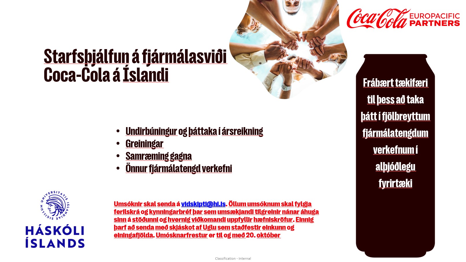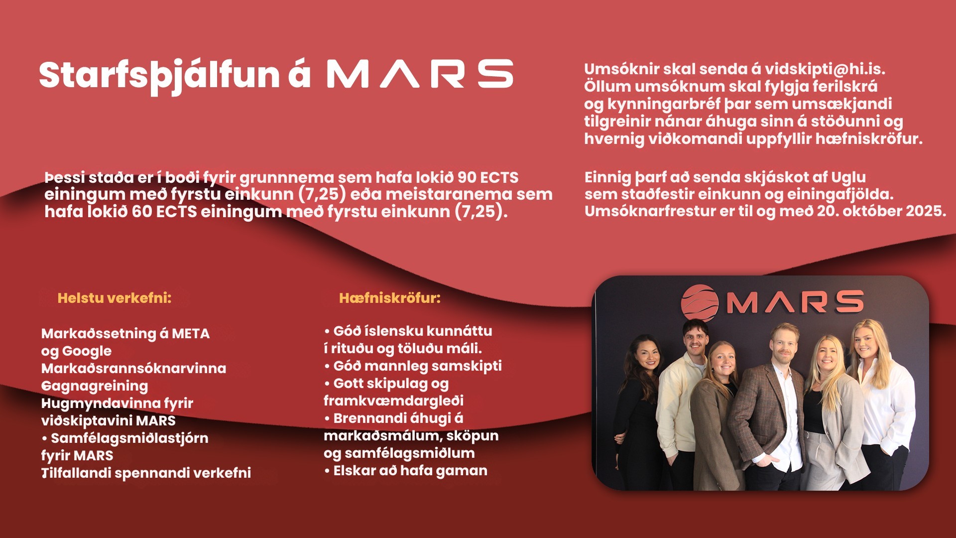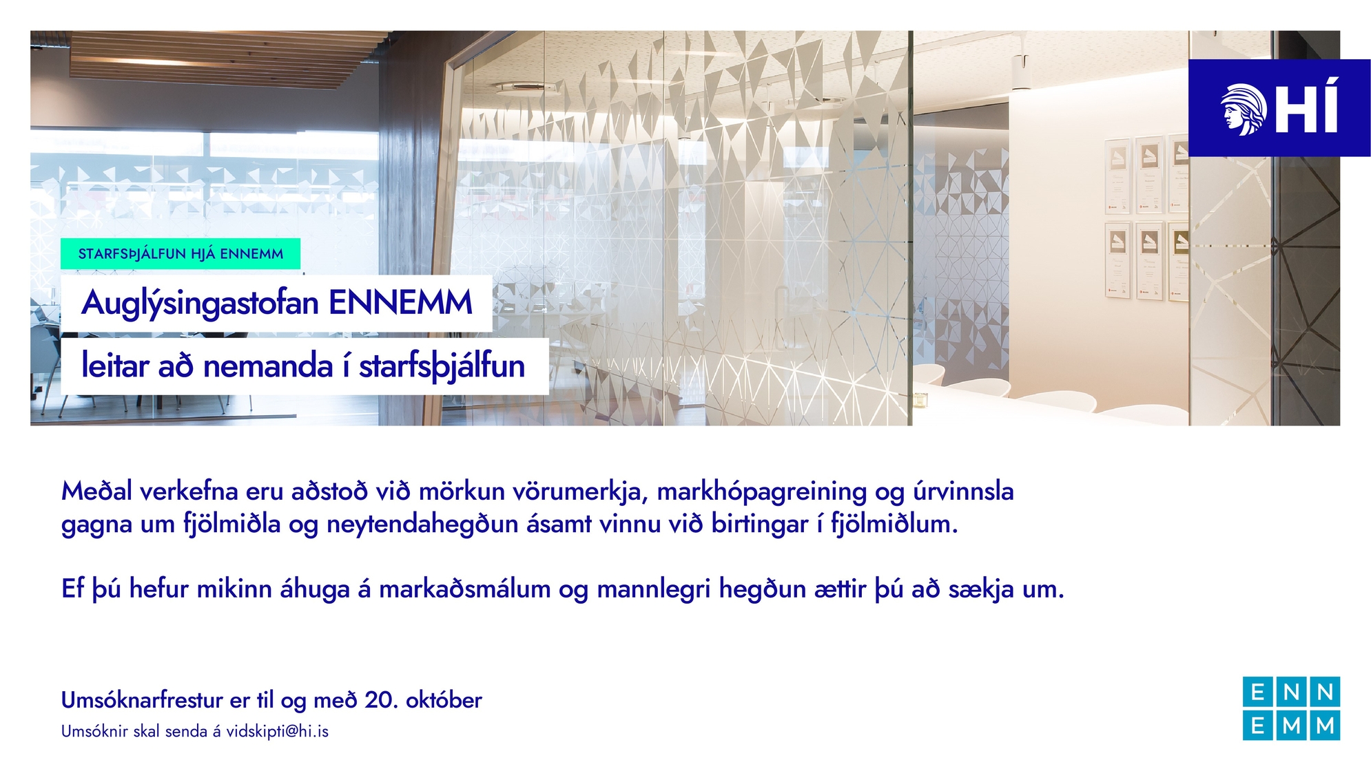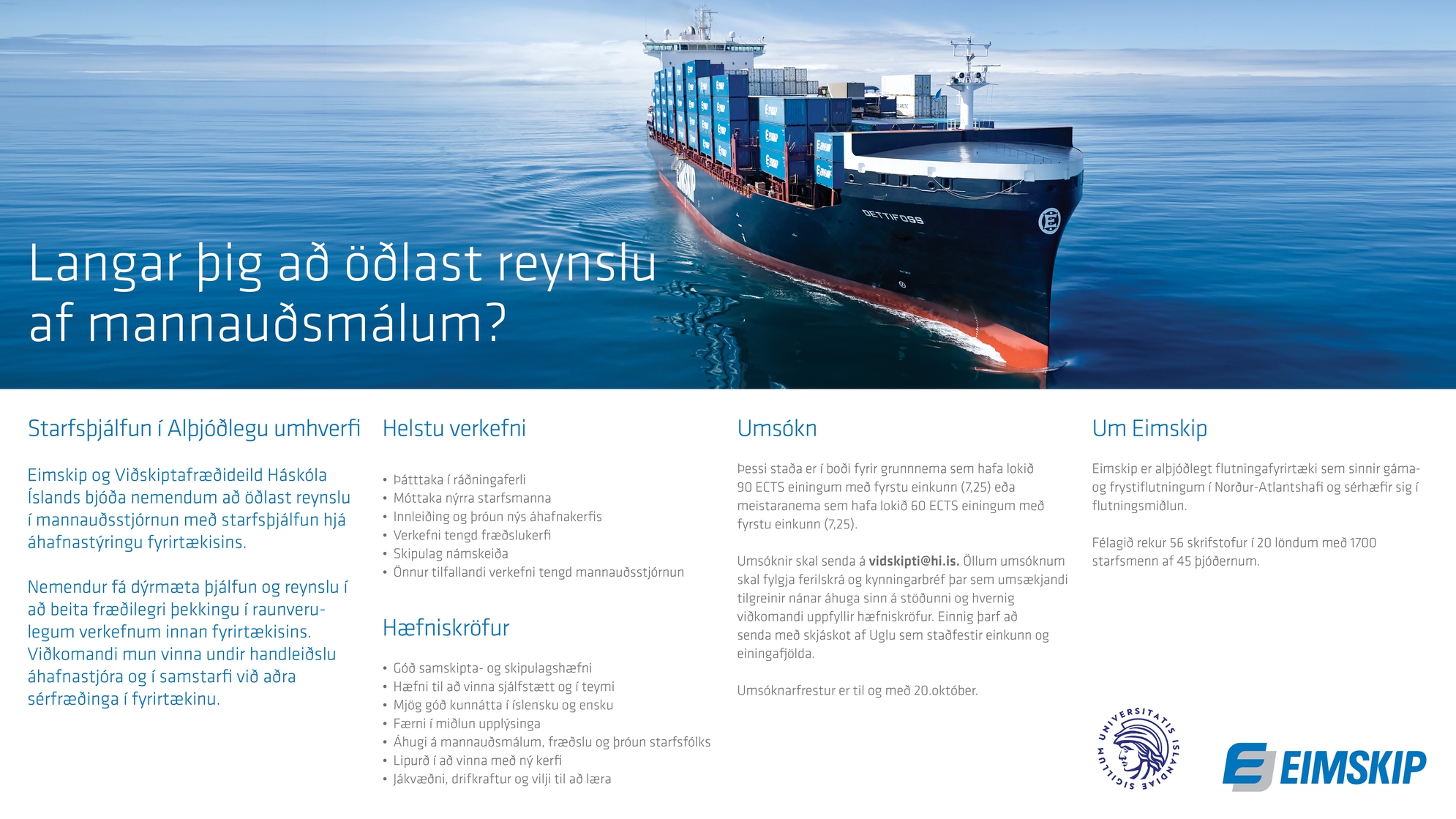 Viðskiptafræðideild Háskóla Íslands er í nánu samstarfi við atvinnulífið og býður nemendum í grunn- og meistaranámi að taka þátt í starfsþjálfun hjá fjölbreyttum fyrirtækjum, stofnunum og félagasamtökum. Nýjar stöður umsóknarfrestur 24. nóvember 2025 66°N Stækka mynd 66°N og Viðskiptafræðideild Háskóla Íslands bjóða nemendum tækifæri til að kynnast starfsemi félagsins gegnum starfsþjálfun. Þessi staða er í boði fyrir grunnnema sem lokið hafa 90 ECTS með fyrstu einkunn (7,25) eða meistaranema sem lokið hafa 60 ECTS með fyrstu einkunn (7,25). Helstu verkefni: Aðstoða með sjálfbærniuppgjör fyrirtækisins Safna saman upplýsingum og undirbúa undir reikning á kolefnisfótspori Aðstoð við sjálfbærniskýrslu. Hæfniskröfur: Áhugi á sjálfbærni Hæfni í mannlegum samskiptum Jákvæðni Stundvísi Heiðarleiki Nákvæmni Umsóknir skal senda á vidskipti@hi.is. Öllum umsóknum skal fylgja ferilskrá og kynningarbréf þar sem umsækjandi tilgreinir nánar áhuga sinn á stöðunni og hvernig viðkomandi uppfyllir hæfniskröfur. Einnig þarf að senda með skjáskot af Uglu sem staðfestir einkunn og einingafjölda. Umsóknarfrestur er til og með 24. nóvember 2025. Birta Media Stækka mynd Birta Media í samstarfi við Viðskiptafræðideild Háskóla Íslands bjóða nemendum sem hafa áhuga á markaðsmálum tækifæri til að kynnast starfsemi félagsins í gegnum starfsþjálfun. Birta Media sér um stafrænar markaðslausnir og tekur meðal annars að sér stafræna markaðssetningu, vefsíðugerð og umsjón með samfélagsmiðlum hjá litlum og meðalstórum fyrirtækjum. Verkefnin eru fjölbreytt og munu gefa innsýn í hvaða færni þarf að búa yfir til þess að ná árangri á stafrænum miðlum. Helstu verkefni: Markaðssetning á netinu Hugmyndavinna Eftirfylgni með samfélagsmiðlaplani Umsjón með Google og Facebook herferðum Gagnagreining Hæfniskröfur: Á auðvelt með að vinna í teymi Góð samskiptafærni Áreiðanleiki Sköpunargleði Góð íslenskukunnátta Þessi staða er í boði fyrir grunnnema sem hafa lokið 90 ECTS einingum með fyrstu einkunn (7,25) eða meistaranema sem hafa lokið 60 ECTS einingum með fyrstu einkunn (7,25). Umsóknir skal senda á vidskipti@hi.is. Öllum umsóknum skal fylgja ferilskrá og kynningarbréf þar sem umsækjandi tilgreinir nánar áhuga sinn á stöðunni og hvernig viðkomandi uppfyllir hæfniskröfur. Einnig þarf að senda með skjáskot af Uglu sem staðfestir einkunn og einingafjölda. Umsóknarfrestur er til og með 24. nóvember 2025. Lyf og heilsa Stækka mynd Lyf og heilsa auglýsir eftir starfsþjálfunarnema á markaðssvið fyrirtækisins. Lyf og heilsa er framsækið verslunar- og þjónustufyrirtæki sem sérhæfir sig á sviði heilsu og heilbrigðis á Íslandi. Lyf og heilsa var upprunalega lyfjaverslun sem með tímanum hefur breyst með áherslum á almenna heilsu. Þessi staða er í boði fyrir grunnnema sem lokið hafa 90 ECTS með fyrstu einkunn (7,25) eða meistaranema sem lokið hafa 60 ECTS með fyrstu einkunn (7,25). Helstu verkefni: Aðkoma að markaðs- kynningar og fræðsluefni í samstarfi við markaðssviðið Framsetning og vinnsla á efni fyrir stafræna miðla í samstarfi við markaðssviðið Skrifa og taka saman upplýsingar um vörur fyrir starfsfólk og viðskiptarvini Úrvinnsla gagna Aðstoð við viðburði og önnur markaðstengd verkefni Hæfniskröfur: Framúrskarandi íslenskukunnátta í töluðu og rituðu máli Góð samskiptahæfni og lausnamiðuð sýn Góð tölvukunnátta Jákvæðni og umbótarmiðuð hugsun Umsóknir skal senda á vidskipti@hi.is. Öllum umsóknum skal fylgja ferilskrá og kynningarbréf þar sem umsækjandi tilgreinir nánar áhuga sinn á stöðunni og hvernig viðkomandi uppfyllir hæfniskröfur. Einnig þarf að senda með skjáskot af Uglu sem staðfestir einkunn og einingafjölda. Umsóknarfrestur er til og með 24. nóvember 2025. Nýsköpunarsjóðurinn Kría Stækka mynd Nýsköpunarsjóðurinn Kría (NSK) og Viðskiptafræðideild Háskóla Íslands bjóða nemendum tækifæri til að kynnast starfsemi sjóðsins í gegnum starfsþjálfun. NSK fjárfestir í sprota- og nýsköpunarfyrirtækjum á fyrstu stigum og styður við nýsköpunarumhverfið á Íslandi. NSK fjárfestir í sjóðum sem sérhæfa sig í fjárfestingum í sprotafyrirtækjum s.s. vísisjóðum og sérhæfðum fjárfestingasjóðum og er í beinum fjárfestingum í sprotafyrirtækjum Í starfsþjálfun hjá NSK fá nemar innsýn inn í hin ýmsu verkefni NSK. Þessi staða er í boði fyrir grunnnema sem lokið hafa 90 ECTS með fyrstu einkunn (7,25) eða meistaranema sem lokið hafa 60 ECTS með fyrstu einkunn (7,25). Hæfniskröfur: Áhugi á nýsköpun Frumkvæði, nákvæmni og sjálfstæð vinnubrögð Góð samskiptahæfni Góð íslenskukunnátta Umsóknir skal senda á vidskipti@hi.is. Öllum umsóknum skal fylgja ferilskrá og kynningarbréf þar sem umsækjandi tilgreinir nánar áhuga sinn á stöðunni og hvernig viðkomandi uppfyllir hæfniskröfur. Einnig þarf að senda með skjáskot af Uglu sem staðfestir einkunn og einingafjölda. Umsóknarfrestur er til og með 24. nóvember 2025. Orkuveitan Stækka mynd Starfsnemi – Jafnréttistímalína Orkuveitunnar Hefur þú áhuga á jafnrétti, fólki og frásögn? Við leitum að skapandi nemanda í starfsnám til að taka virkan þátt í að móta og miðla jafnréttissögu Orkuveitunnar og dótturfélaga hennar. Um verkefnið Markmiðið er að gera jafnréttisvinnu Orkuveitunnar lifandi og sýnilega með því að þróa stafræna jafnréttistímalínu á heimasíðu okkar. Verkefnið er samvinnuverkefni milli mannauðs og samskiptadeildar og felur í sér að tengjast fólki innan fyrirtækisins og skapa efni sem vekur áhuga og sýnir árangurinn á skapandi og skemmtilegan hátt. Þú munt meðal annars: Eiga samtöl við fólk