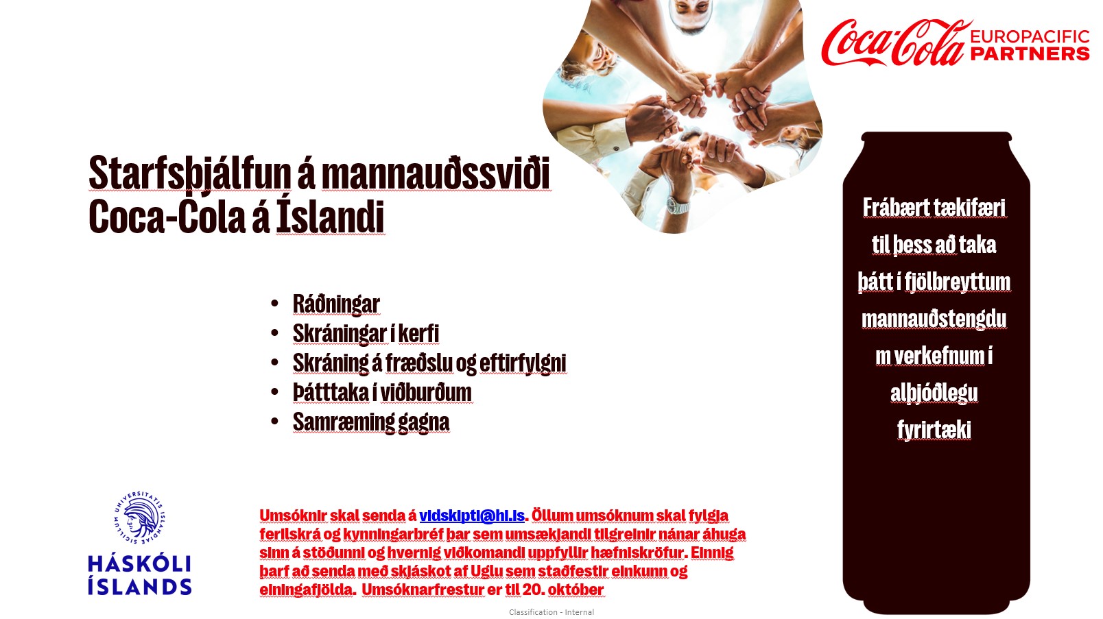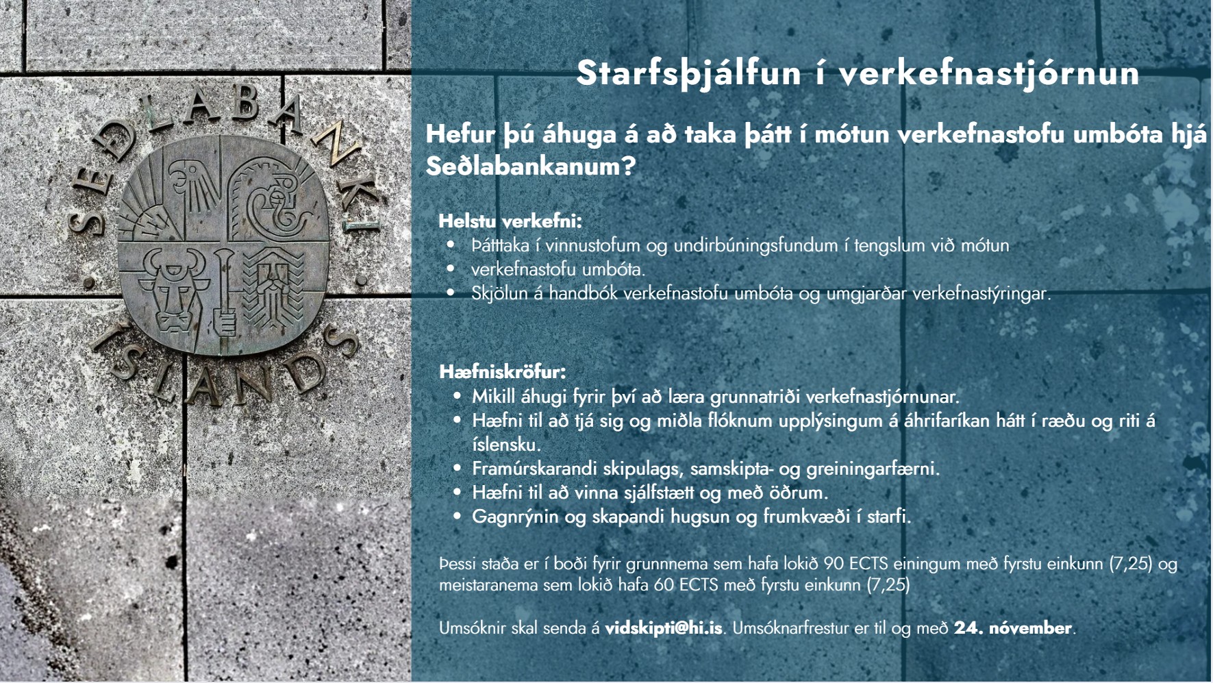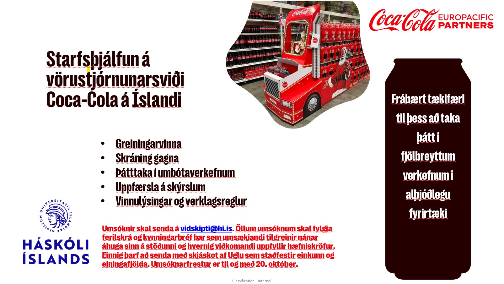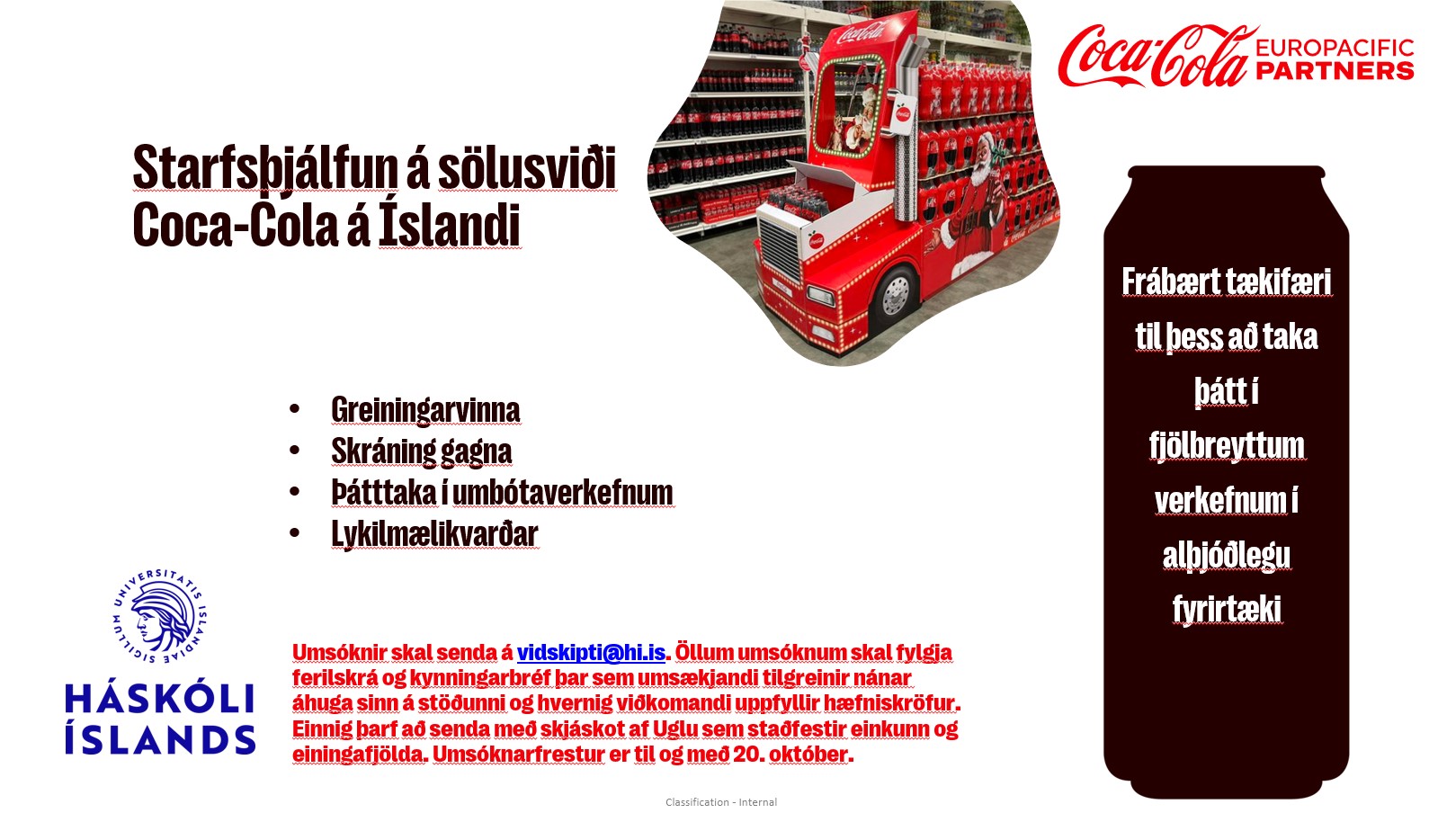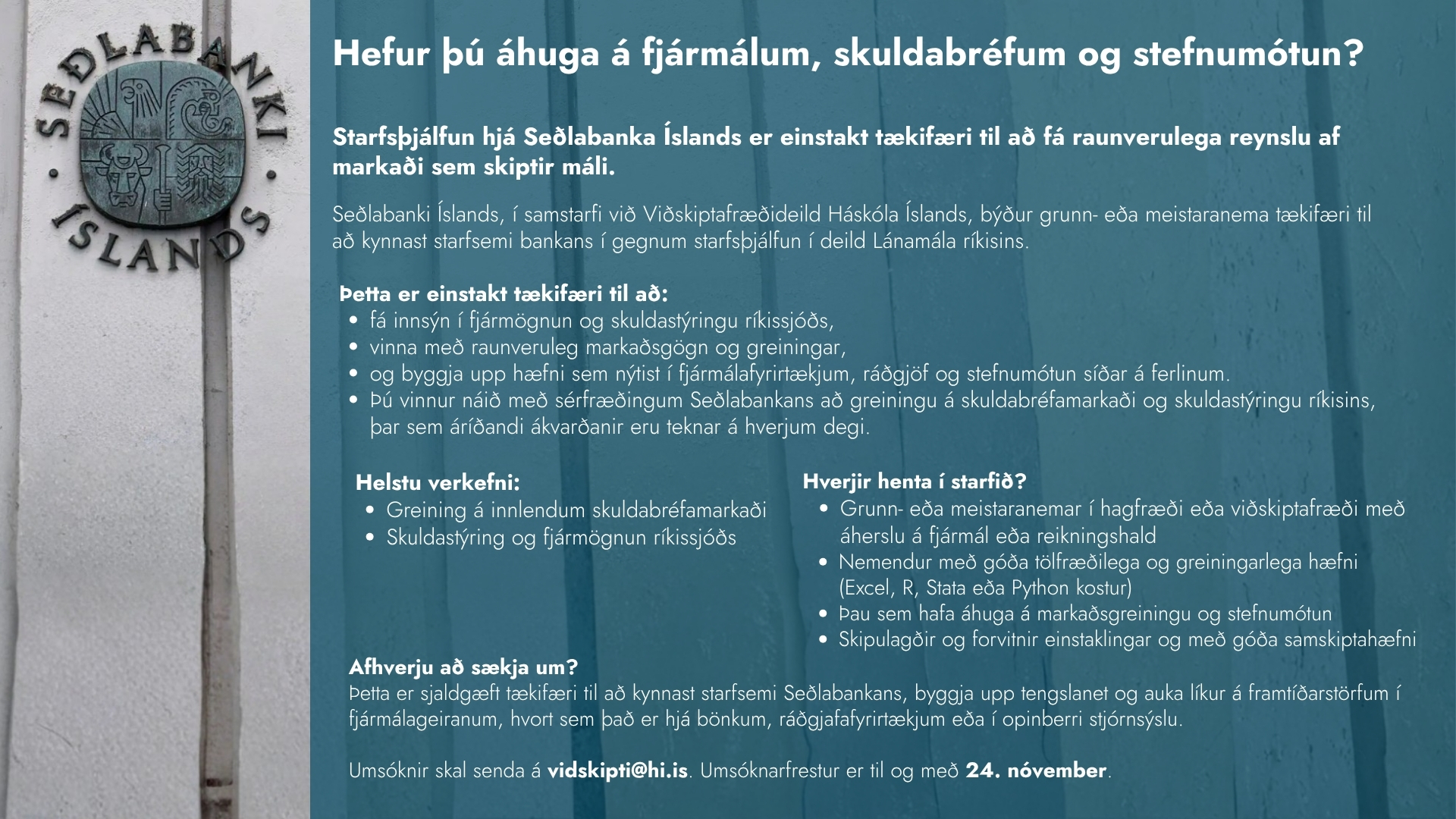 Viðskiptafræðideild Háskóla Íslands er í nánu samstarfi við atvinnulífið og býður nemendum í grunn- og meistaranámi að taka þátt í starfsþjálfun hjá fjölbreyttum fyrirtækjum, stofnunum og félagasamtökum. Nýjar stöður umsóknarfrestur 24. nóvember 2025 66°N Stækka mynd 66°N og Viðskiptafræðideild Háskóla Íslands bjóða nemendum tækifæri til að kynnast starfsemi félagsins gegnum starfsþjálfun. Þessi staða er í boði fyrir grunnnema sem lokið hafa 90 ECTS með fyrstu einkunn (7,25) eða meistaranema sem lokið hafa 60 ECTS með fyrstu einkunn (7,25). Helstu verkefni: Aðstoða með sjálfbærniuppgjör fyrirtækisins Safna saman upplýsingum og undirbúa undir reikning á kolefnisfótspori Aðstoð við sjálfbærniskýrslu. Hæfniskröfur: Áhugi á sjálfbærni Hæfni í mannlegum samskiptum Jákvæðni Stundvísi Heiðarleiki Nákvæmni Umsóknir skal senda á vidskipti@hi.is. Öllum umsóknum skal fylgja ferilskrá og kynningarbréf þar sem umsækjandi tilgreinir nánar áhuga sinn á stöðunni og hvernig viðkomandi uppfyllir hæfniskröfur. Einnig þarf að senda með skjáskot af Uglu sem staðfestir einkunn og einingafjölda. Umsóknarfrestur er til og með 24. nóvember 2025. Birta Media Stækka mynd Birta Media í samstarfi við Viðskiptafræðideild Háskóla Íslands bjóða nemendum sem hafa áhuga á markaðsmálum tækifæri til að kynnast starfsemi félagsins í gegnum starfsþjálfun. Birta Media sér um stafrænar markaðslausnir og tekur meðal annars að sér stafræna markaðssetningu, vefsíðugerð og umsjón með samfélagsmiðlum hjá litlum og meðalstórum fyrirtækjum. Verkefnin eru fjölbreytt og munu gefa innsýn í hvaða færni þarf að búa yfir til þess að ná árangri á stafrænum miðlum. Helstu verkefni: Markaðssetning á netinu Hugmyndavinna Eftirfylgni með samfélagsmiðlaplani Umsjón með Google og Facebook herferðum Gagnagreining Hæfniskröfur: Á auðvelt með að vinna í teymi Góð samskiptafærni Áreiðanleiki Sköpunargleði Góð íslenskukunnátta Þessi staða er í boði fyrir grunnnema sem hafa lokið 90 ECTS einingum með fyrstu einkunn (7,25) eða meistaranema sem hafa lokið 60 ECTS einingum með fyrstu einkunn (7,25). Umsóknir skal senda á vidskipti@hi.is. Öllum umsóknum skal fylgja ferilskrá og kynningarbréf þar sem umsækjandi tilgreinir nánar áhuga sinn á stöðunni og hvernig viðkomandi uppfyllir hæfniskröfur. Einnig þarf að senda með skjáskot af Uglu sem staðfestir einkunn og einingafjölda. Umsóknarfrestur er til og með 24. nóvember 2025. Lyf og heilsa Stækka mynd Lyf og heilsa auglýsir eftir starfsþjálfunarnema á markaðssvið fyrirtækisins. Lyf og heilsa er framsækið verslunar- og þjónustufyrirtæki sem sérhæfir sig á sviði heilsu og heilbrigðis á Íslandi. Lyf og heilsa var upprunalega lyfjaverslun sem með tímanum hefur breyst með áherslum á almenna heilsu. Þessi staða er í boði fyrir grunnnema sem lokið hafa 90 ECTS með fyrstu einkunn (7,25) eða meistaranema sem lokið hafa 60 ECTS með fyrstu einkunn (7,25). Helstu verkefni: Aðkoma að markaðs- kynningar og fræðsluefni í samstarfi við markaðssviðið Framsetning og vinnsla á efni fyrir stafræna miðla í samstarfi við markaðssviðið Skrifa og taka saman upplýsingar um vörur fyrir starfsfólk og viðskiptarvini Úrvinnsla gagna Aðstoð við viðburði og önnur markaðstengd verkefni Hæfniskröfur: Framúrskarandi íslenskukunnátta í töluðu og rituðu máli Góð samskiptahæfni og lausnamiðuð sýn Góð tölvukunnátta Jákvæðni og umbótarmiðuð hugsun Umsóknir skal senda á vidskipti@hi.is. Öllum umsóknum skal fylgja ferilskrá og kynningarbréf þar sem umsækjandi tilgreinir nánar áhuga sinn á stöðunni og hvernig viðkomandi uppfyllir hæfniskröfur. Einnig þarf að senda með skjáskot af Uglu sem staðfestir einkunn og einingafjölda. Umsóknarfrestur er til og með 24. nóvember 2025. Nýsköpunarsjóðurinn Kría Stækka mynd Nýsköpunarsjóðurinn Kría (NSK) og Viðskiptafræðideild Háskóla Íslands bjóða nemendum tækifæri til að kynnast starfsemi sjóðsins í gegnum starfsþjálfun. NSK fjárfestir í sprota- og nýsköpunarfyrirtækjum á fyrstu stigum og styður við nýsköpunarumhverfið á Íslandi. NSK fjárfestir í sjóðum sem sérhæfa sig í fjárfestingum í sprotafyrirtækjum s.s. vísisjóðum og sérhæfðum fjárfestingasjóðum og er í beinum fjárfestingum í sprotafyrirtækjum Í starfsþjálfun hjá NSK fá nemar innsýn inn í hin ýmsu verkefni NSK. Þessi staða er í boði fyrir grunnnema sem lokið hafa 90 ECTS með fyrstu einkunn (7,25) eða meistaranema sem lokið hafa 60 ECTS með fyrstu einkunn (7,25). Hæfniskröfur: Áhugi á nýsköpun Frumkvæði, nákvæmni og sjálfstæð vinnubrögð Góð samskiptahæfni Góð íslenskukunnátta Umsóknir skal senda á vidskipti@hi.is. Öllum umsóknum skal fylgja ferilskrá og kynningarbréf þar sem umsækjandi tilgreinir nánar áhuga sinn á stöðunni og hvernig viðkomandi uppfyllir hæfniskröfur. Einnig þarf að senda með skjáskot af Uglu sem staðfestir einkunn og einingafjölda. Umsóknarfrestur er til og með 24. nóvember 2025. Orkuveitan Stækka mynd Starfsnemi – Jafnréttistímalína Orkuveitunnar Hefur þú áhuga á jafnrétti, fólki og frásögn? Við leitum að skapandi nemanda í starfsnám til að taka virkan þátt í að móta og miðla jafnréttissögu Orkuveitunnar og dótturfélaga hennar. Um verkefnið Markmiðið er að gera jafnréttisvinnu Orkuveitunnar lifandi og sýnilega með því að þróa stafræna jafnréttistímalínu á heimasíðu okkar. Verkefnið er samvinnuverkefni milli mannauðs og samskiptadeildar og felur í sér að tengjast fólki innan fyrirtækisins og skapa efni sem vekur áhuga og sýnir árangurinn á skapandi og skemmtilegan hátt. Þú munt meðal annars: Eiga samtöl við fólk