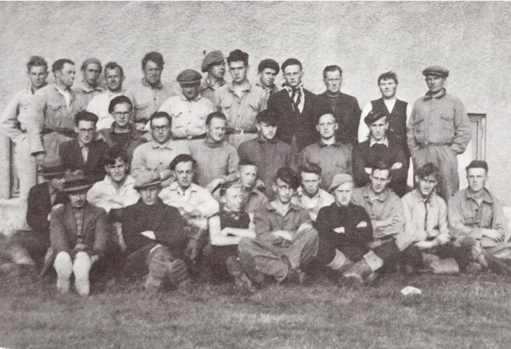 Stúdentar og verkamenn sem unnu við að grafa grunn Aðalbyggingar. Guðjón Klemensson læknir átti myndina.