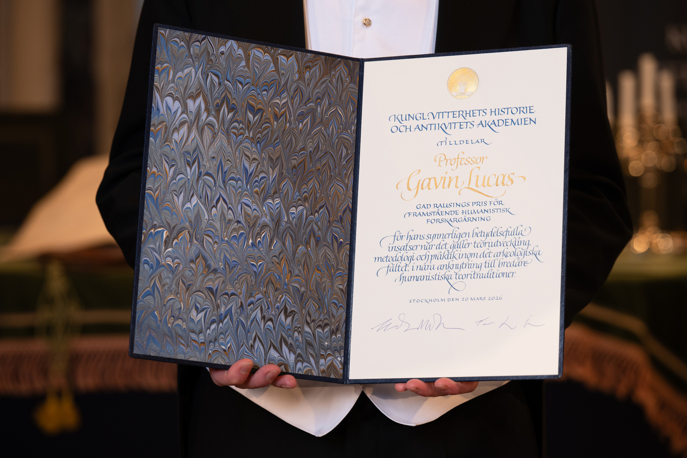 Gavin Lucas, prófessor í fornleifafræði við Deild heimspeki, sagnfræði og fornleifafræði við Háskóla Íslands, fékk Gad Rausing verðlaunin afhent við hátíðlega athöfn á ársfundi sænsku Kungliga vitterhetsakademien 20. mars síðastliðinn fyrir framúrskarandi framlag til rannsókna á sviði hugvísinda. Karl Gústaf, konungur Svíþjóðar, afhenti verðlaunin.