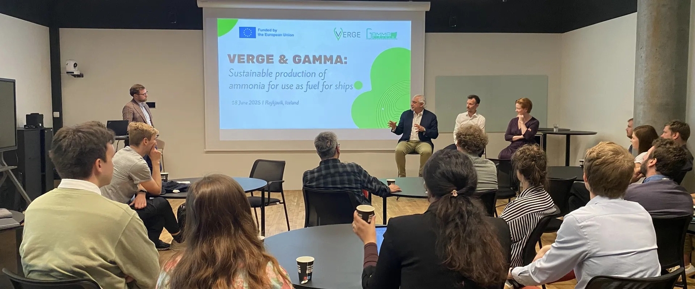 Í pallborðsumræðum tóku þátt Helga Dögg Flosadóttir, framkvæmdastjóri Atmonia ehf., Kjartan Due Nielsen og Spyros Kouvelis, ráðgefandi sérfræðingur VERGE og teymisstjóri í samstarfsverkefni ESB og Persaflóaríkjanna um græna umbreytingu. Öll þrjú tóku þátt í áhugaverðum umræðum um núverandi stöðu ammoníaks sem rafeldsneytis, sérstaklega með tilliti til skipaflota innan Evrópusambandsins og á Íslandi.