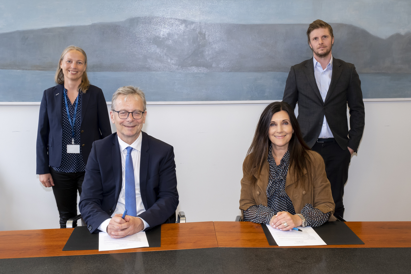Samningurinn var undirritaður í háskólaráðsherbergi HÍ. Standandi eru þau Ólöf Vigdís Ragnarsdóttir, deildarstjóri nýsköpunar við Vísinda- og nýsköpunarsvið HÍ, og Jón Gunnarsson, samskiptastjóri Hugverkastofunnar. Sitjandi eru Jón Atli Benediktsson, rektor Háskóla Íslands, og Borghildur Erlingsdóttir, forstjóri Hugverkastofunnar