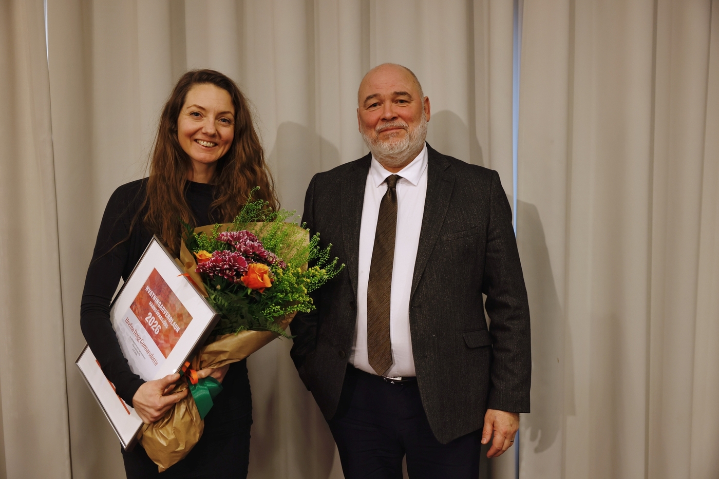 Handhafi Hvatningarverðlauna Rannsóknasjóðs 2026, Hrefna Dögg Gunnarsdóttir. og ráðherra menningar, nýsköpunar- og háskóla, Logi Einarsson. MYND/Arnaldur Halldórsson