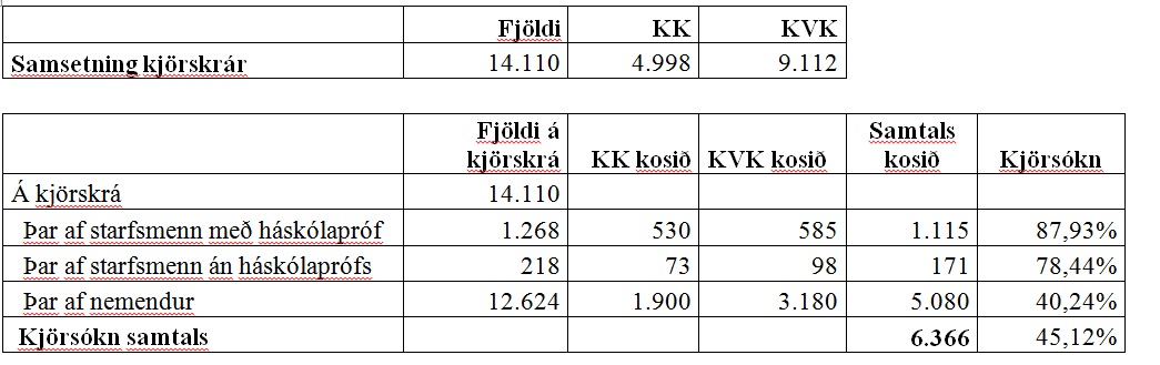 Á kjörskrá voru 14.110, þar af 1.486 starfsmenn og 12.624 stúdentar. Við kosningar greiddu atkvæði alls 1.286 starfsmenn eða 86,6% á kjörskrá og 5.080 stúdentar eða 40,2% á kjörskrá. Alls greiddu 6.366 atkvæði og var því kosningaþátttaka í heild 45,1%. Atkvæði utan kjörfundar voru 71 og auðir seðlar voru 206 eða 3,2% af greiddum atkvæðum. Gild atkvæði voru því 6.160. Atkvæði skiptust þannig:
