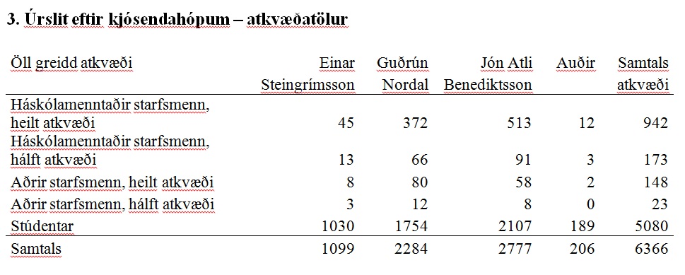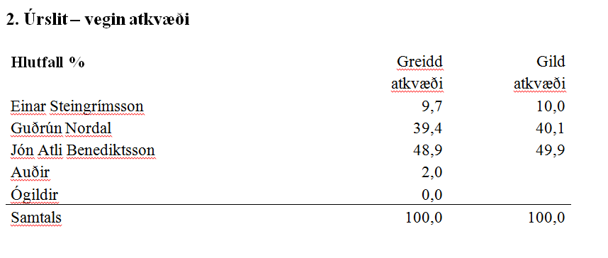 Þar sem enginn frambjóðenda fékk meirihluta greiddra atkvæða eins og 2. mgr. 7. tl. 6. gr. reglna nr. 569/2009 fyrir Háskóla Íslands kveður á um verður kosið að nýju um Guðrúnu Nordal og Jón Atla Benediktsson mánudaginn 20. apríl nk.