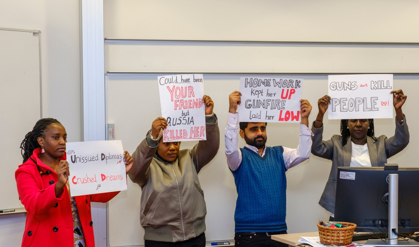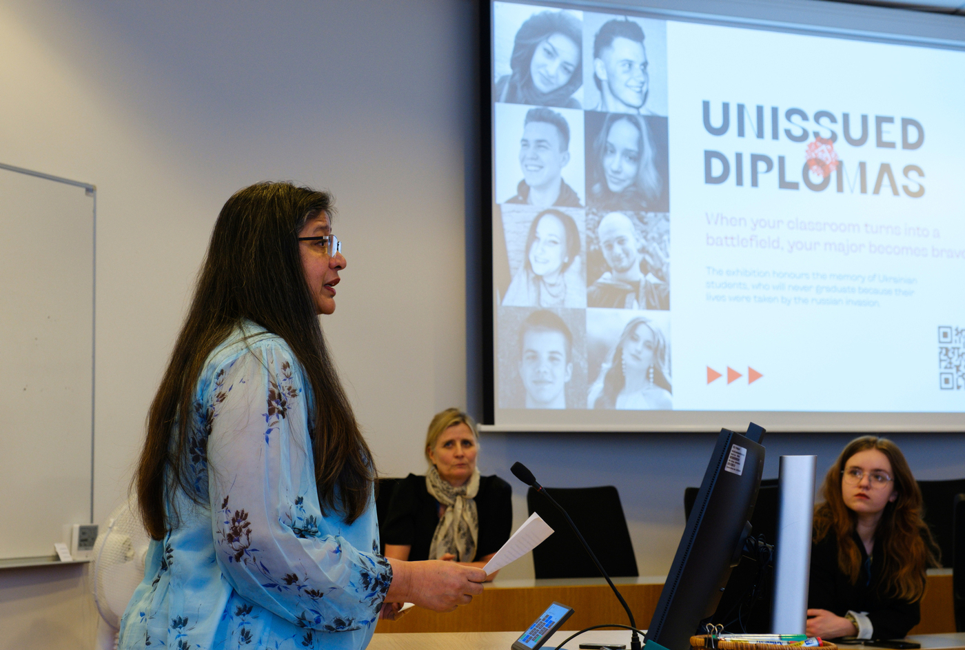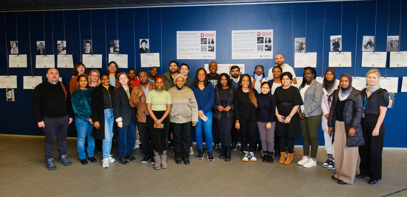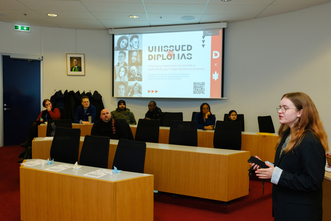 Nemendur í Jafnréttisskólanum settu sýninguna upp á bláa veggnum í Tröð, ganginum milli Gimlis og Háskólatorgs, og stóð hún frá 23.-26. febrúar. Sýningin hefur ferðast um heiminn og samanstendur af 40 táknrænum útskriftarskírteinum ásamt myndum sem fylgir hverju og einu skírteini. Hvert skírteini segir sögu úkraínsks námsmanns sem aldrei mun útskrifast því viðkomandi lét lífið í innrás Rússa í Úkraínu sem hófst 24. febrúar 2022.