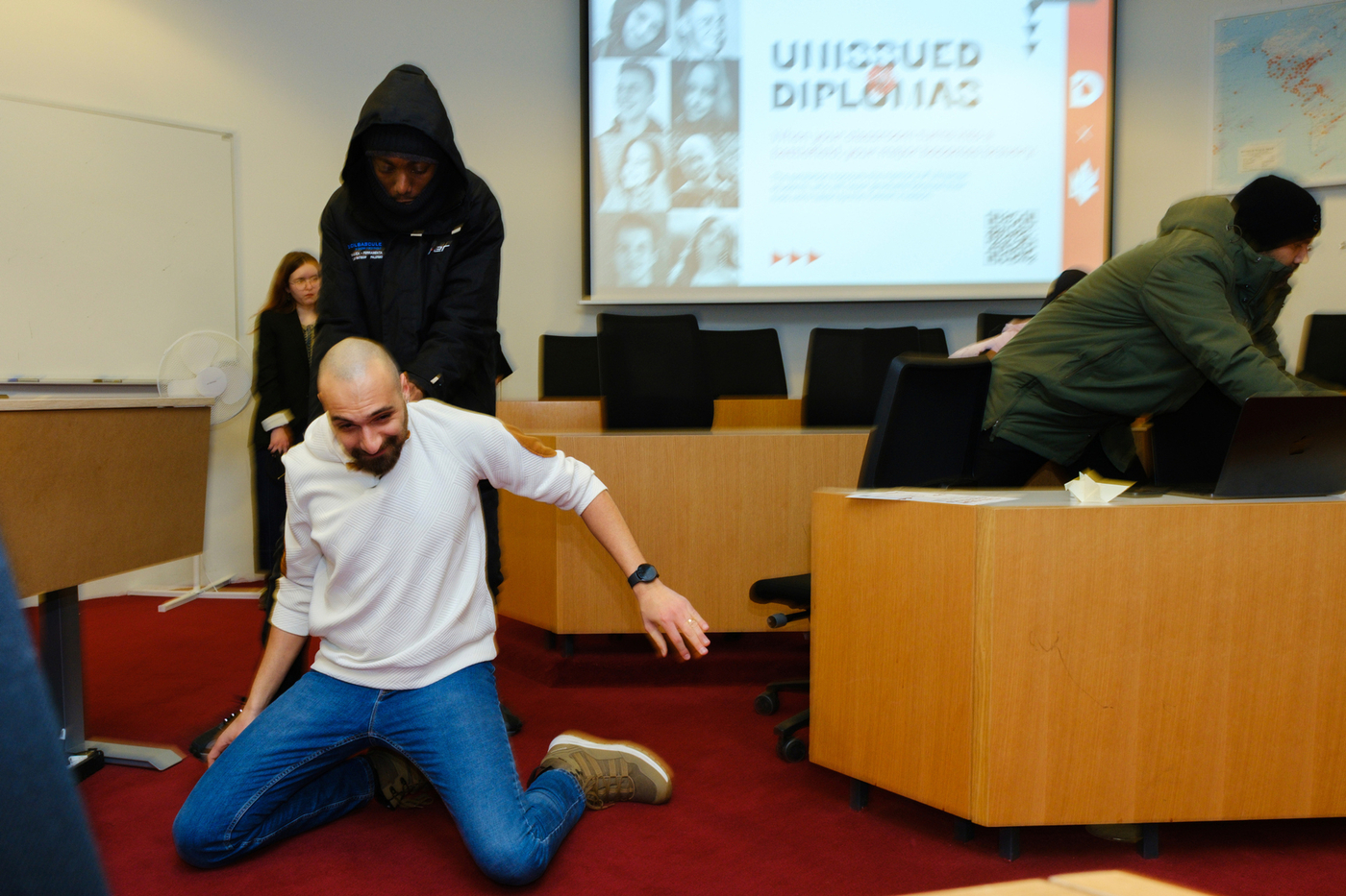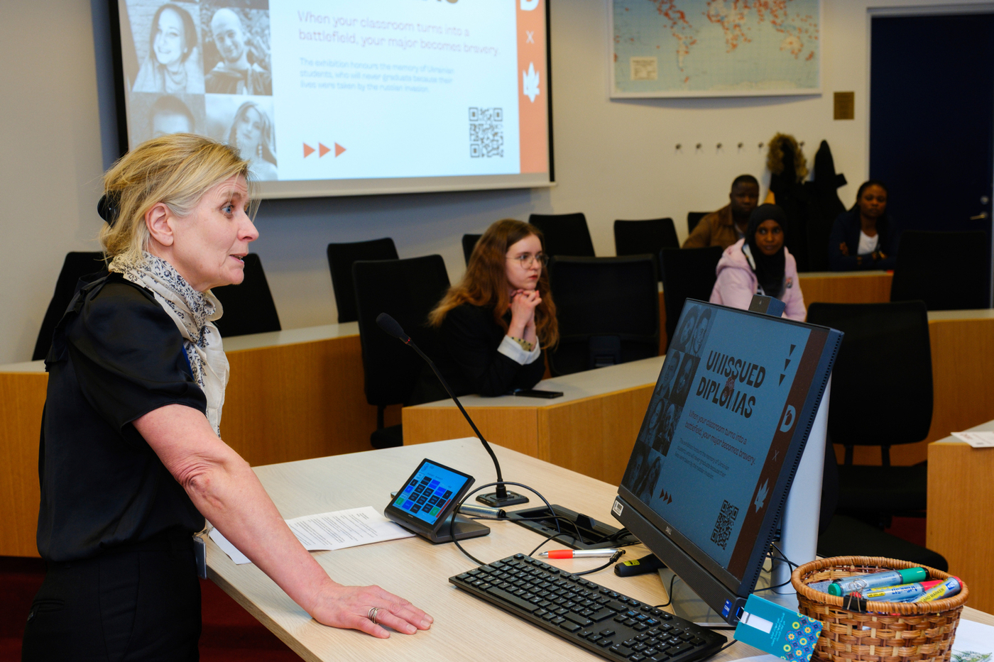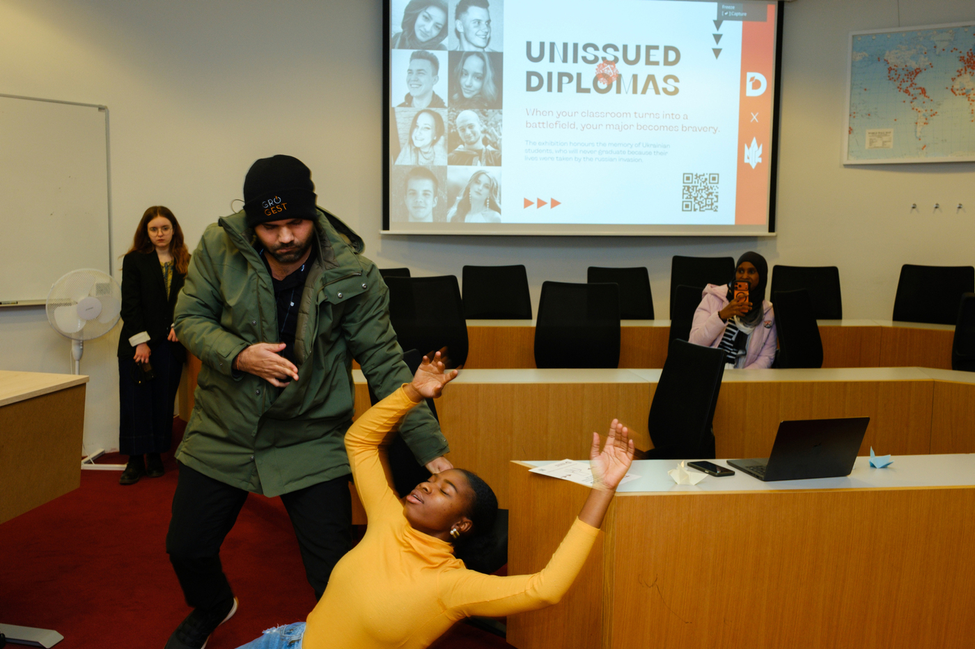 Nemendur í Jafnréttisskólanum settu sýninguna upp á bláa veggnum í Tröð, ganginum milli Gimlis og Háskólatorgs, og stóð hún frá 23.-26. febrúar. Sýningin hefur ferðast um heiminn og samanstendur af 40 táknrænum útskriftarskírteinum ásamt myndum sem fylgir hverju og einu skírteini. Hvert skírteini segir sögu úkraínsks námsmanns sem aldrei mun útskrifast því viðkomandi lét lífið í innrás Rússa í Úkraínu sem hófst 24. febrúar 2022.