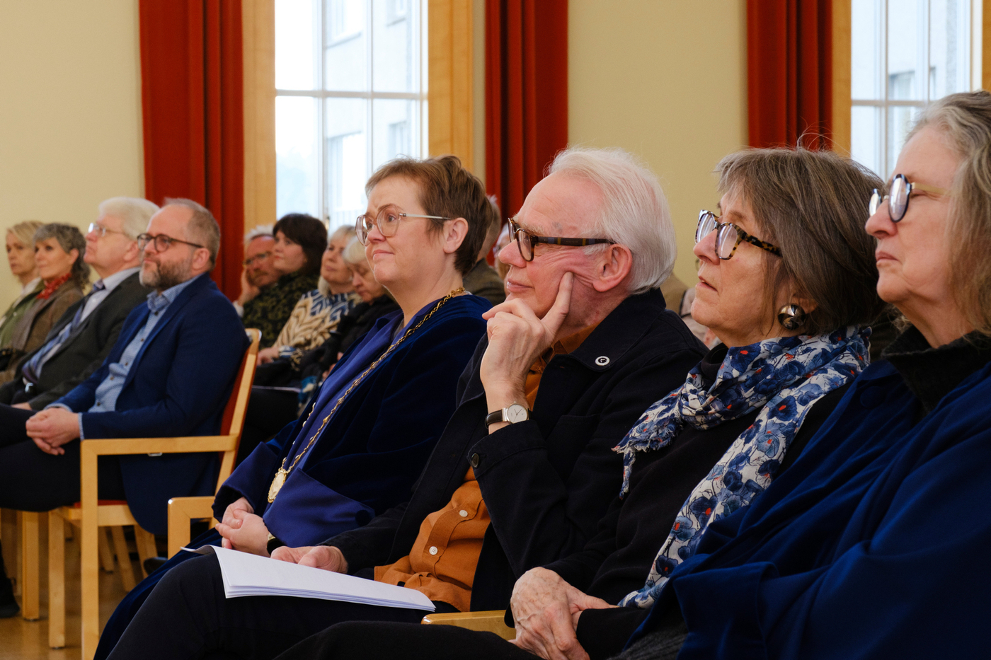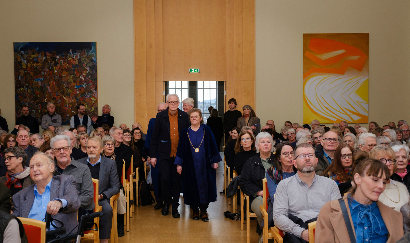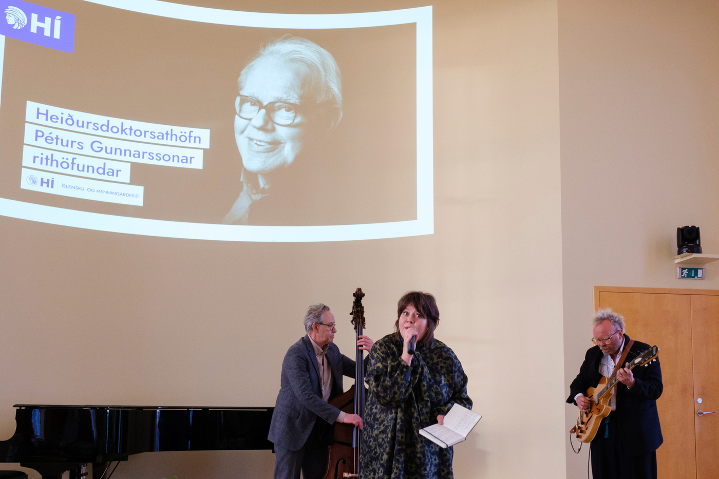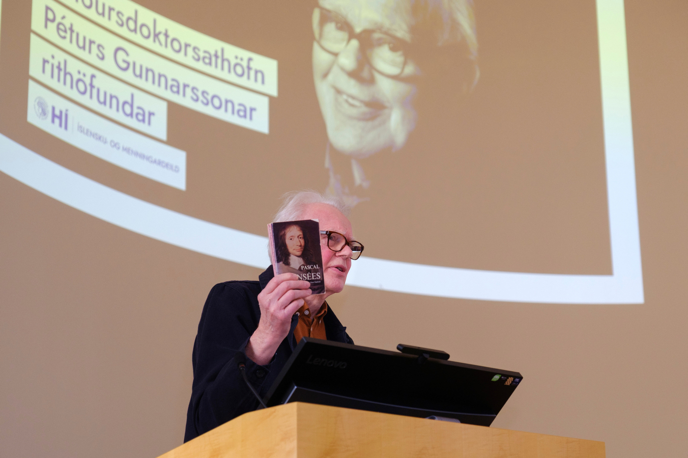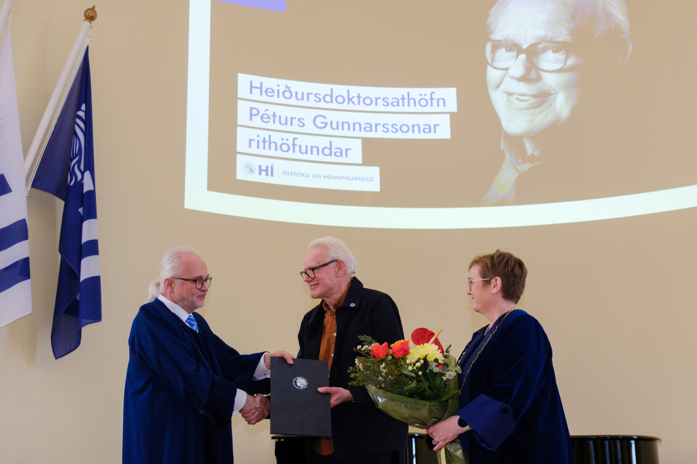 2. febrúar 2026 Pétur Gunnarsson heiðursdoktor við Íslensku- og menningardeild Hlusta Pétur Gunnarsson rithöfundur hefur verið sæmdur heiðursdoktorsnafnbót við Íslensku- og menningardeild Háskóla Íslands. Pétur hefur skrifað á annan tug skáldsagna, ævisöguleg rit um tvo helstu rithöfunda Íslendinga, rit af sjálfsævisögulegum toga, pistla og þýðingar á öndvegisverkum franskra bókmennta. Hann hefur einnig unnið merkt starf sem dagskrárgerðarmaður í útvarpi og sjónvarpi og höfundur pistla af margvíslegum toga, að ógleymdum sönglagatextum sem lifa enn góðu lífi á margra vörum. Torfi Tulinius, prófessor við Íslensku- og menningardeild, sagði í ávarpi að deildin ætti Pétri mikið að þakka: „Hann hefur helgað líf sitt einmitt því sem við fáumst daglega við að rannsaka og kenna: íslenskri tungu, bókmenntum, listinni, þýðingu heimsbókmennta á okkar ástkæra ylhýra mál. Hans mikla höfundarverk einkennist af frumleika, stílfimi og trú á manninum og þörf hans fyrir merkingu í háskasamlegum og hverfulum heimi… heimi þar sem allir dagar byrja samt fallega.“ Vísaði Torfi þar í upphafskvæði fyrstu bókar Péturs Gunnarssonar, ljóðabókarinnar Splunkunýr dagur frá 1973: Af jarðarinnar hálfu byrja allir dagar fallega þolinmóð snýst hún og snýst með trén og höfin og vötnin eyðimerkurnar og eldfjöllin okkur tvö og ykkur hin og öll dýrin Smellið hér til að lesa ávarp Torfa í heild sinni Af jarðarinnar hálfu byrja allir dagar fallega þolinmóð snýst hún og snýst með trén og höfin og vötnin eyðimerkurnar og eldfjöllin okkur tvö og ykkur hin og öll dýrin Þannig hljómar upphafskvæðið í fyrstu bók Péturs Gunnarssonar, ljóðabókinni Splunkunýr dagur frá 1973. Löngu síðar, á þingi sem haldið var hér í Háskólanum þegar Pétur varð sextugur, sagðist hann vera þakklátur fyrir að hafa fengið að hefja höfundarverk sitt á þessum línum: „Af jarðarinnar hálfu byrja allir dagar fallega.“ Eru ekki mörg helstu einkenni skáldsins fram komin í þessu stutta ljóði? Hæfileikinn til að horfa á heiminn og íbúa þess úr fjarlægð, heildræn sýn þar sem örfá orð nægja til að kalla auðlegð hans fram í huga lesandans. Sterk tilfinning fyrir fegurðinni, væntumþykja fyrir lífinu, mannkyninu, „ykkur hinum“, fyrir dýrunum. Sambandið mikilvæga við ástina í lífinu: „okkur tvö“. Jörðin snýst þolinmóð. Hún lætur ekkert hagga sér. En hvað með mannfólkið? Ég var enn í menntaskóla, snemma árs 1976, þ.e. fyrir réttri hálfri öld, þegar ég sótti samkomu í Háskólabíói sem „Listaskáldin vondu“ boðuðu til: Steinunn Sigurðardóttir, Sigurður Pálsson, Guðbergur Bergsson, Þórarinn Eldjárn, fleiri. Og Pétur sem steig þar fram sem prósahöfundur og las valda kafla úr væntanlegri skáldsögu. Þar heyrðum við fyrst höfundarrödd Péturs. Hún var yfirlætislaus, góðlátleg, orðfærið hversdagslegt, en markvisst og meitlað. Smám saman lauk hún upp fyrir okkur nýjum heimi, heimi okkar, kynslóðanna sem fæddumst í kaldastríðinu og ólumst upp i nýtilkominni velmegun áranna eftir seinni heimsstyrjöld. Þessi heimur hafði ekki áður öðlast þegnrétt í bókmenntunum en aðrir höfundar áttu eftir að tileinka sér hann: heimur íslenskrar æsku sem fæddist eftir stofnun lýðveldisins, hafði Reykjavík sem miðpunkt tilveru sinnar og útlönd sem viðmið. Þetta var ógleymanleg stund, því þó við könnuðumst við þennan heim, var hann baðaður sérstökum ljóma: hlýrri, mennskri birtu, sem brá skoplegu en jafnframt góðlátlegu ljósi á líf okkar og umhverfi. Þeir sem voru þarna gleyma ekki viðbrögðunum. Pétur átti bókstaflega salinn sem veltist um af hlátri, ekki yfirborðskenndum, ekki grófum, ekki meinfýsnum, heldur innilegum hlátri þess sem sér heiminn allt í einu á nýjan hátt. Í endurminningabók sinni Skriftum, líkir Pétur sjálfur látunum í salnum við þrjú bíó bernskuáranna. Það kom ekki á óvart að skáldsagan sem hann las upp úr, Punktur, punktur, komma, strik, og var gefin út seinna þetta sama ár, 1976, skyldi ná fáheyrðum vinsældum. Stíllinn var lipur og léttur, fullur af glettni og frjóum hugmyndum. Eftir fylgdu Ég um mig frá mér til mín (1978), Persónur og leikendur (1982) og Sagan öll (1985). Í öllum þessum bókum er aðalpersónan Andri Haraldsson. Fylgst er með honum frá fæðingu þar til hann kemur heim frá námi og er í þann veginn að hefja líf fullorðins manns í íslensku samfélagi. Titlarnir segja sitt um viðfangsefnið. Smám saman verður til mynd af manneskju í mótun, svolítið eins og þegar Óli prik verður til á blaðinu með punktum, kommum og striki. Hvernig skyldi þessum einstaklingi ganga að búa sjálfan sig til í þessum heimi? Hver er þessi ég… um mig, frá mér… til mín? Hvernig á hann að stíga fram? Hvert verður hlutverk hans á leiksviði samfélagsins? Með síðustu Andrabókinni er saga hans öll og straumhvörf verða í miðri sögu. Við skiljum við Andra æpandi eins og afglapi á torgi í Kaupmannahöfn og ný persóna stígur á svið: Guðmundur Andri, ekki lengur æskumaður heldur fjölskyldufaðir sem situr daglangt við tölvu og slær inn texta, milli þess sem hann sinnir börnum og heimili. Tónninn hefur breyst og nýr veruleiki tekinn við í verkum Péturs. En áður en við skiljum við glæsilega byrjun á höfundarferli Péturs og talandi um Guðmund Andra, þá hitti ég einu sinni Guðmund Andra Thorsson á förnum vegi. Spjall okkar barst að Pétri og fyrstu verkum hans. Guðmundur Andri sagði nokkuð sem sat í mér: „Pétur Gunnarsson kom með Bítlana inn í íslenskar bókmenntir.“ Við ræddum þetta ekki nánar en svona skil ég þetta: Eins og strákarnir frá Liverpool, sýndi Pétur hæfilegt vir