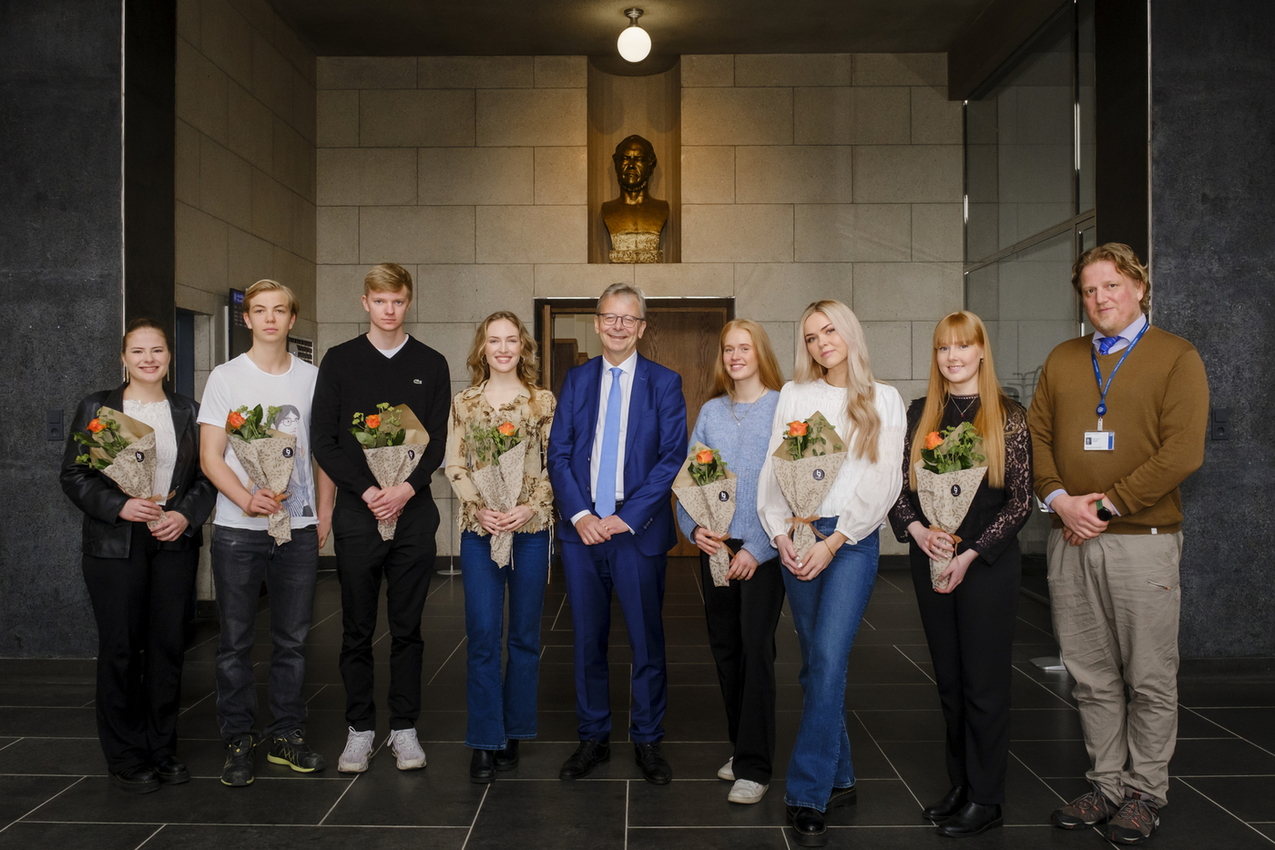 Nemendurnir sjö heimsóttu rektorsskrifstofu nýverið og hittu þar fyrir Jón Atla Benediktsson, rektor og Hafliða Sævarsson, verkefnisstjóra á Alþjóðasviði
