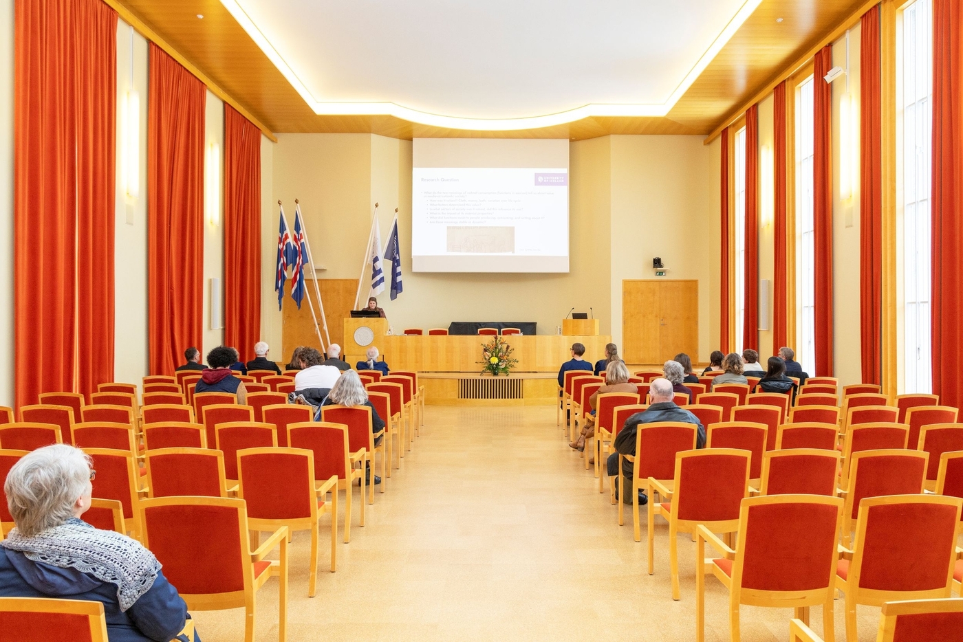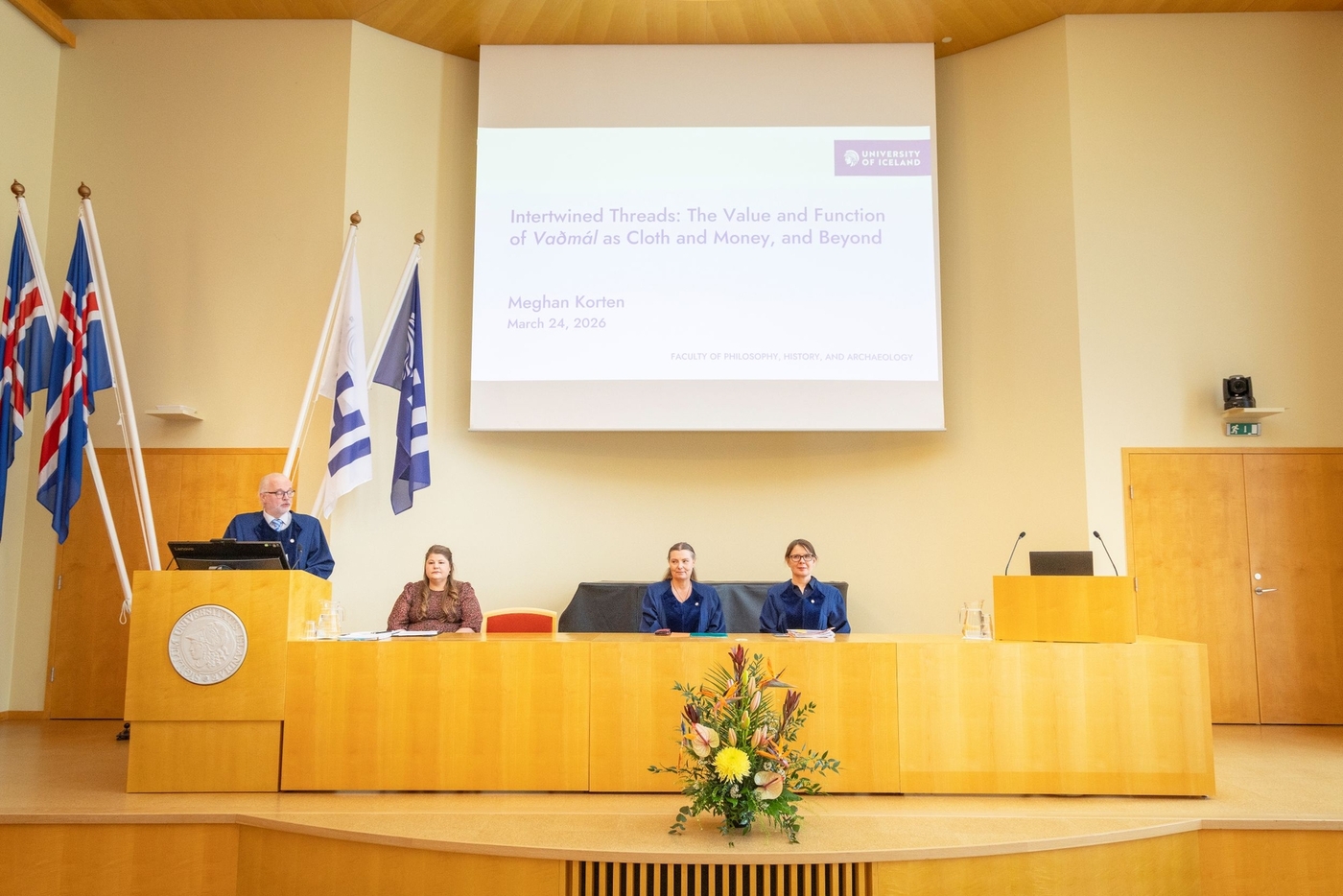 Andmælendur við vörnina voru Susanna Harris, lektor við háskólann í Glasgow í Skotlandi, og Eva Andersson, lektor við háskólann í Gautaborg í Svíþjóð. Gauti Kristmannsson, deildarforseti Íslensku- og menningardeildar, stjórnaði athöfninni sem fór fram í Hátíðasal í Aðalbyggingu Háskóla Íslands 24. mars.