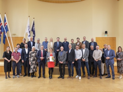 Fjöldi manns kom saman í Hátíðasal þegar viðurkenning var veitt úr Nýsköpunarsjóði dr. Þorsteins Inga Sigfússonar. Þeirra á meðal voru forystufólk Optitogs og stofnendur, stór hópur sem komið hefur að þróun hugmyndarinnar, fjölskylda Þorsteins Inga, rektor og stjórn sjóðsins. MYND/Gunnar Sverrisson