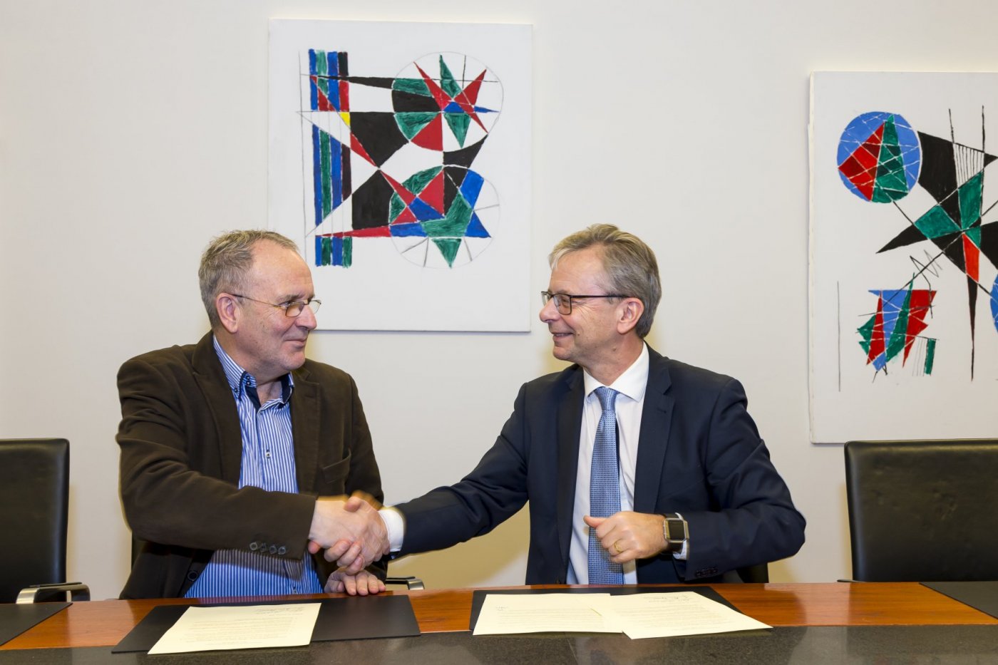 Páll Gíslason, formaður Verkfræðingafélags Íslands, og Jón Atli Benediktsson, rektor Háskóla Íslands, handsala samstarfssamninginn