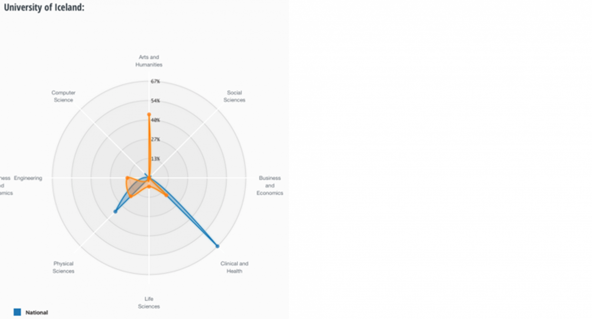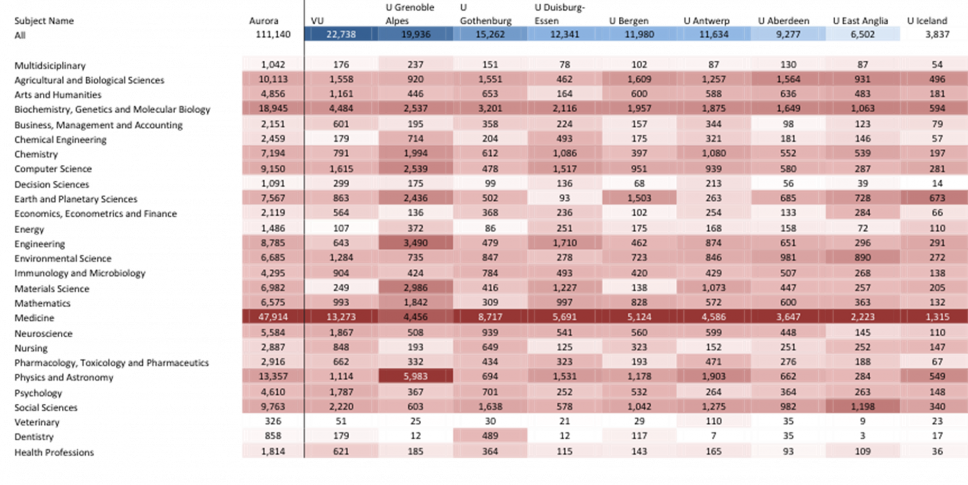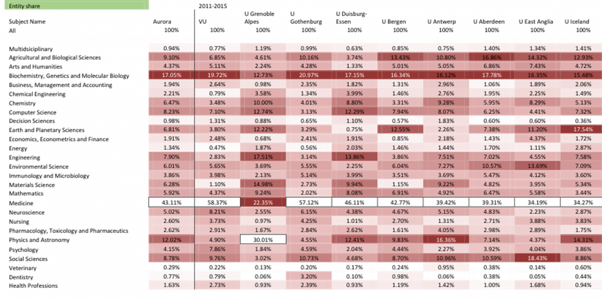 Háskólar í Aurora – Hlutdeild faggreina í birtingum