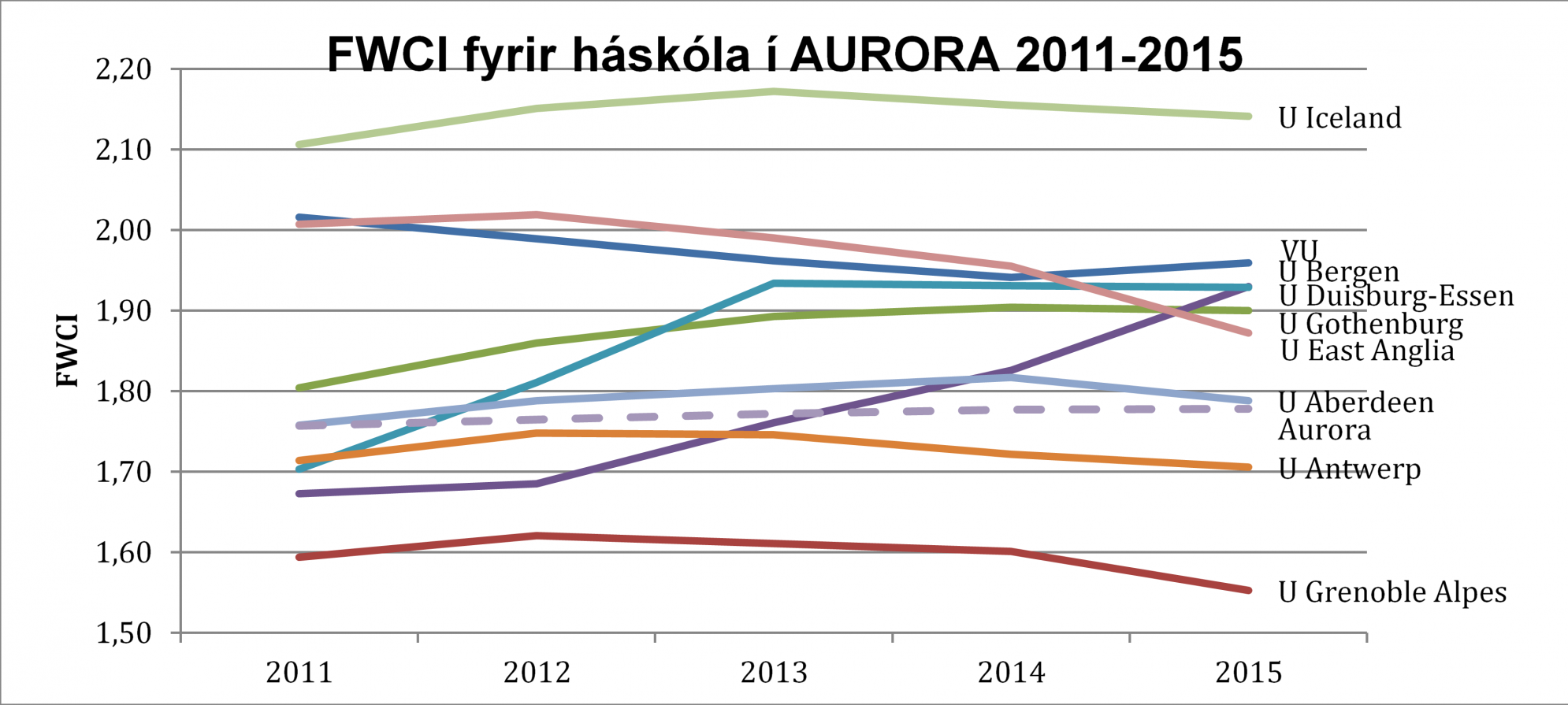 Háskólar í Aurora – Heildar-FWCI eftir háskólum