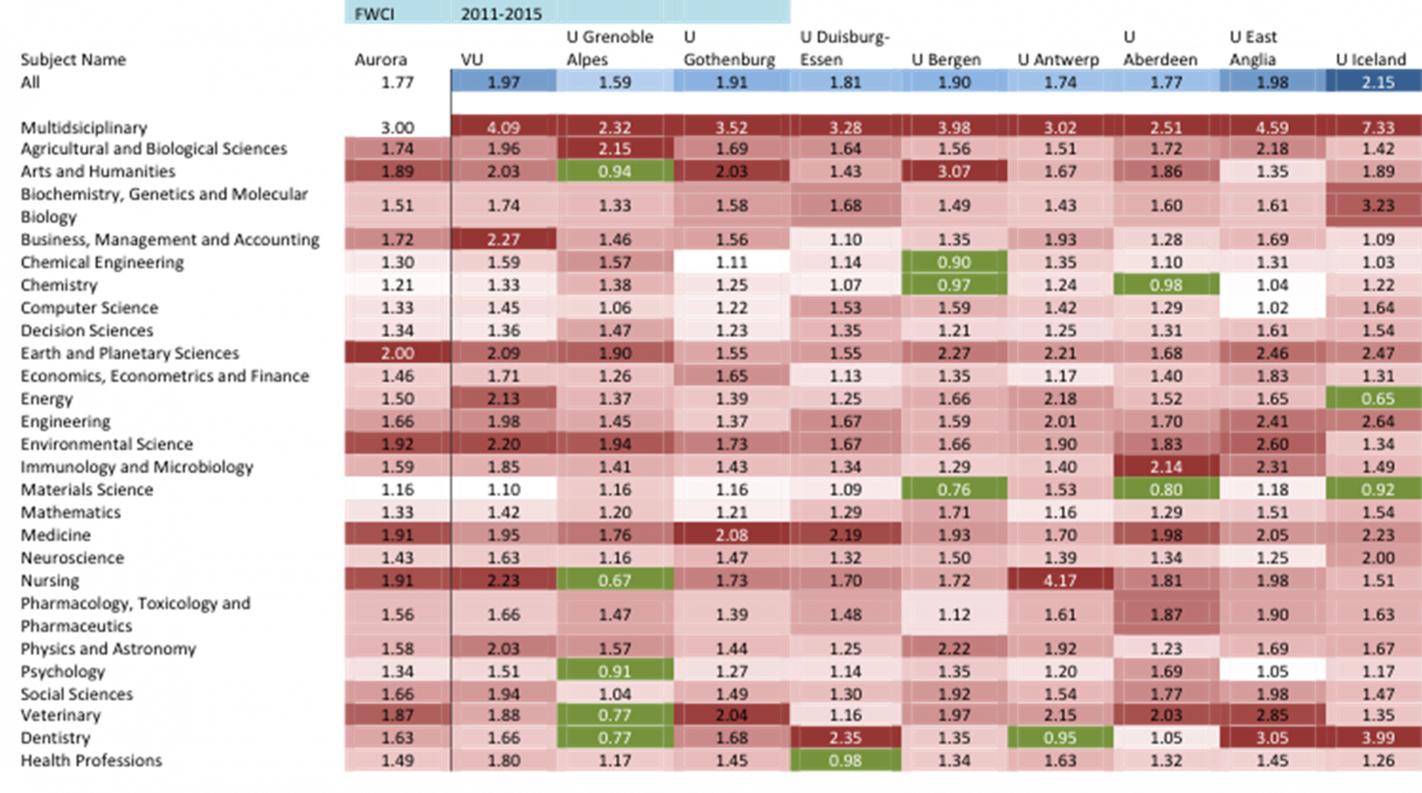 Háskólar í Aurora – FWCI eftir faggreinum hjá háskólum