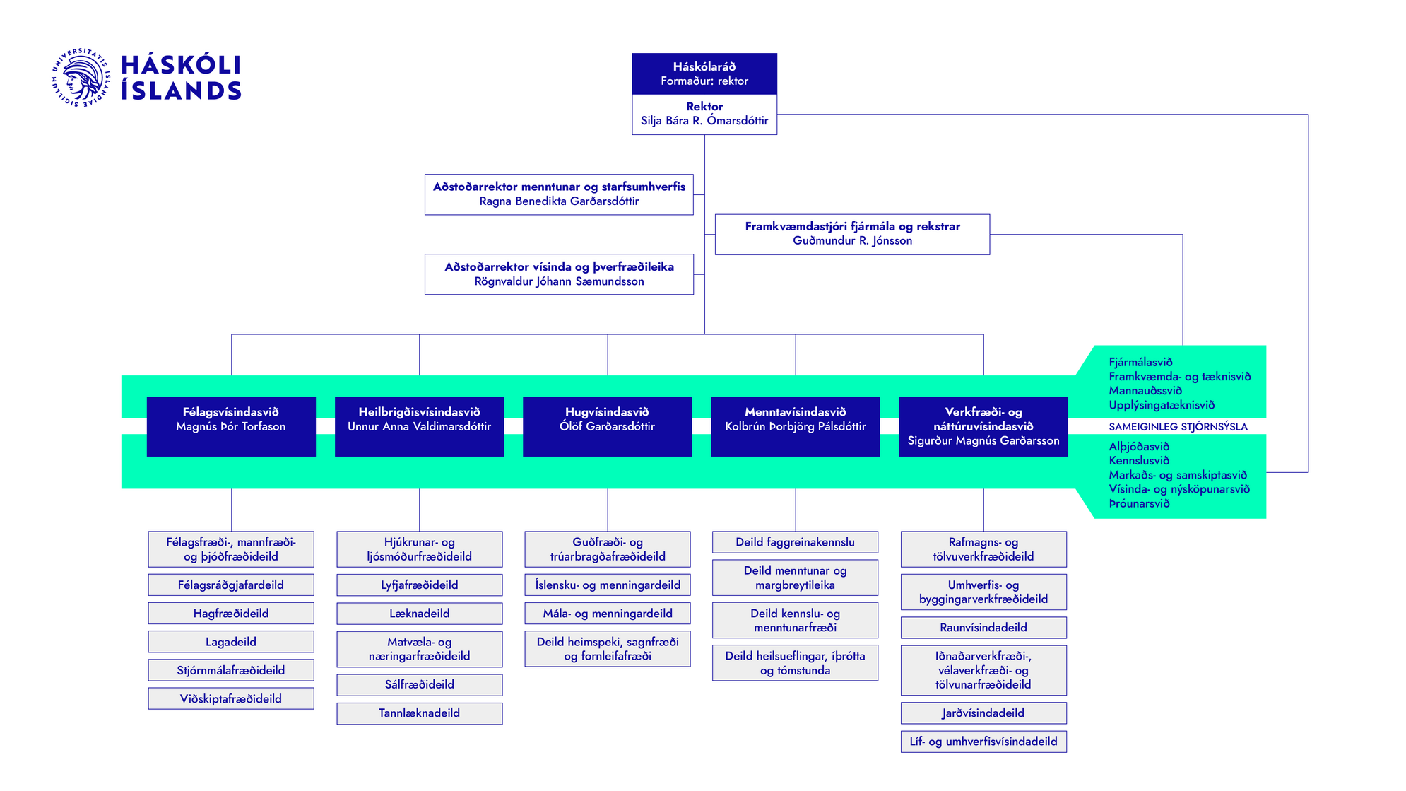 Meira um lykilstjórnendur Silja Bára R. ÓmarsdóttirRektor5254302sbo [hjá] hi.is Ragna Benedikta GarðarsdóttirAðstoðarrektor menntunar og starfsumhverfis5254178rbg [hjá] hi.is Rögnvaldur Jóhann SæmundssonAðstoðarrektor vísinda og þverfræðileika5254623rjs [hjá] hi.is Guðmundur Ragnar JónssonFramkvæmdastjóri fjármála og rekstrargrj [hjá] hi.is Forsetar fræðasviða Kolbrún Þorbjörg PálsdóttirForseti fræðasviðs5255965kolbrunp [hjá] hi.is Magnús Þór TorfasonForseti fræðasviðs5254291torfason [hjá] hi.is Ólöf GarðarsdóttirForseti fræðasviðs3545255350olofgard [hjá] hi.is Sigurður M GarðarssonForseti fræðasviðs5254659sigmg [hjá] hi.is Unnur Anna ValdimarsdóttirForseti fræðasviðs5254072unnurav [hjá] hi.is Sviðsstjórar stoðþjónustu Friðrika Þóra HarðardóttirSviðsstjóri alþjóðasviðs5254146fridrika [hjá] hi.is Guðmundur H KjærnestedSviðsstjóri upplýsingatæknimála5254150ghkjaerne [hjá] hi.is Halldór JónssonSviðsstjóri vísinda- og nýsköpunarsvið5254337dorij [hjá] hi.is Jenný Bára JensdóttirSviðsstjóri fjármálasviðs5254094jbj [hjá] hi.is Jón Örn GuðbjartssonSviðsstjóri markaðsmála5254260jonorn [hjá] hi.is Kristinn JóhannessonSviðsstjóri framkvæmda- og tæknimála5255288kjohannesson [hjá] hi.is Kristinn AndersenSviðsstjóri kennslumála5254688kiddi [hjá] hi.is Ragnhildur ÍsaksdóttirSviðsstjóri mannauðssviðs5254355ragnhildurisaks [hjá] hi.is Sæunn StefánsdóttirSviðsstjóri þróunarsviðs5254041saeunnst [hjá] hi.is Háskólaráð Myndir af lykilstjórnendum Hér að neðan má finna myndir af lykilstjórnendum innan Háskóla Íslands sem fjölmiðlum er heimilt að nýta. Þó verður að geta ljósmyndara við notkun: Kristinn Ingvarsson. Ef óskað er eftir myndunum í meiri upplausn, vinsamlegast sendið ósk um það á kri@hi.is. facebooklinkedintwitter