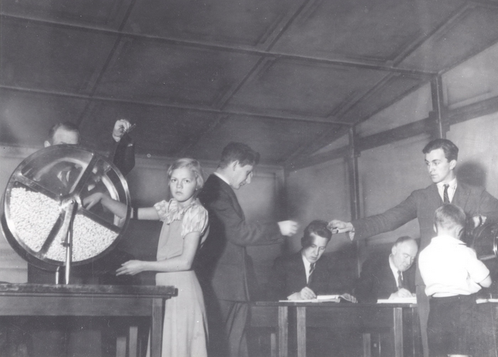 Frá fyrsta drætti í Happdrætti Háskóla Íslands í mars 1934. Mynd fengin af aldarafmælisvef Háskóla Íslands.