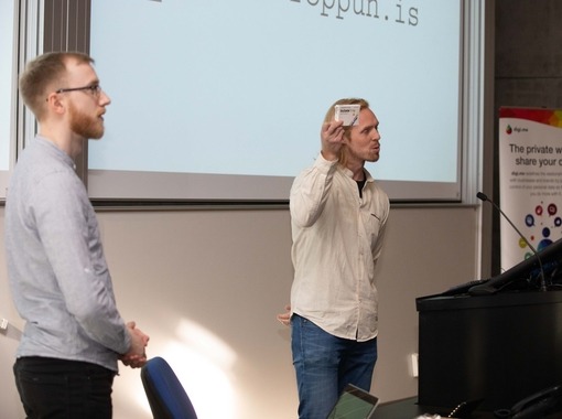 „Ég lauk gráðu í eðlisfræði áður en ég hóf nám í læknisfræði og tók töluvert af valnámskeiðum í tölvunarfræði sem nýttust vel í vinnunni um helgina. Við vinnum báðir að þróun hugmynda, ég sé síðan fyrst og fremst um forritunarvinnuna en Kjartan hefur aðallega séð um kynningarvinnuna í verkefninu. Það er nefnilega ekki nóg að hafa góða hugmynd og ná að þróa hana, þú þarft líka að geta kynnt hana vel fyrir dómnefnd og áheyrendum,“ segir Árni sem er hér ásamt Kjartani á kynningu verkefnisins fyrir dómnefnd. MYND/Facebook-síða Nordic Health Hackathon